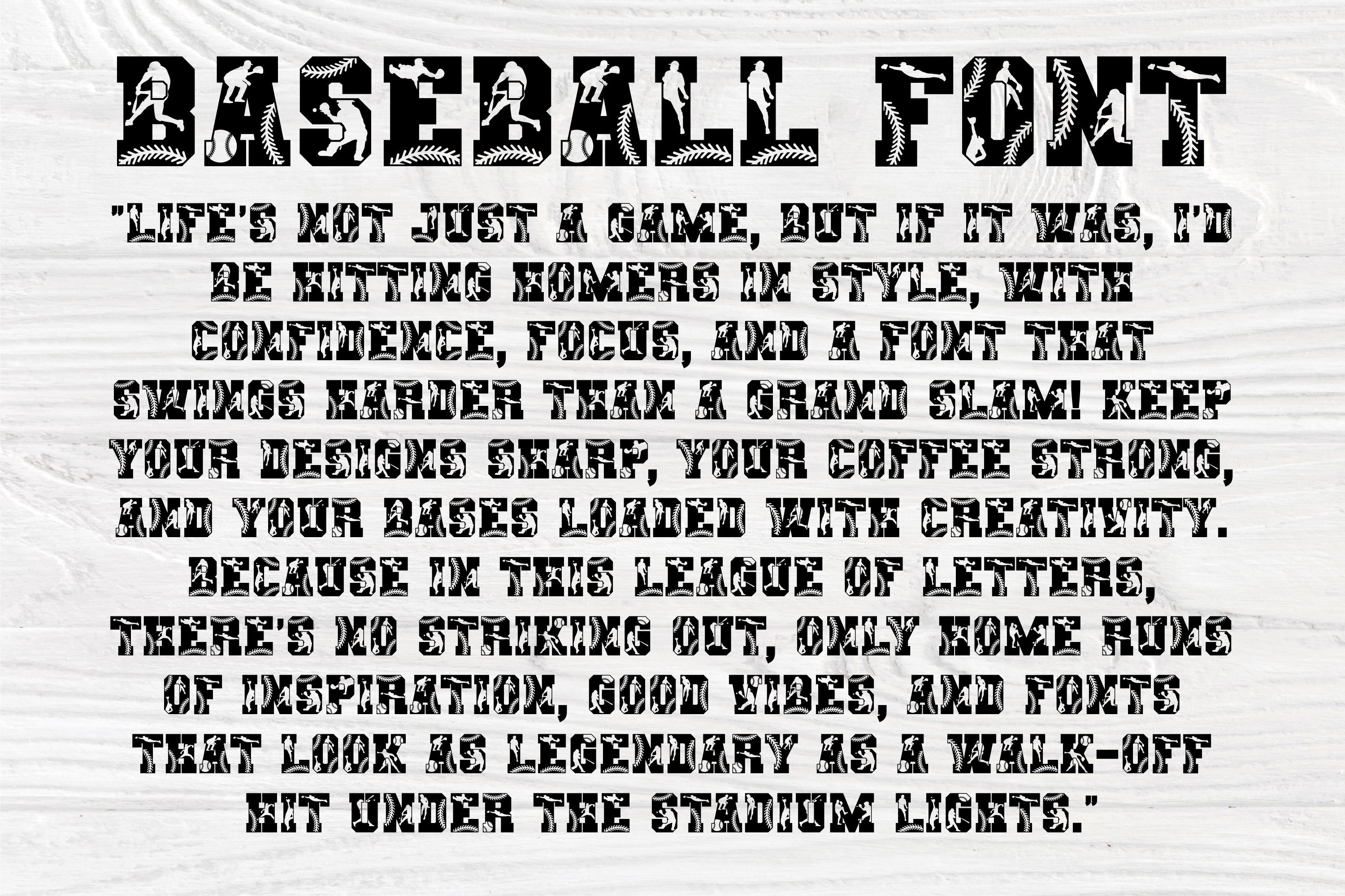 Step up to the plate with the Baseball Font, a bold varsity-style typeface inspired by the heart and hustle of the game. Each letter is filled with baseball silhouettes — players swinging, pitching, and catching — combined with detailed stitching lines that bring the authentic feel of the sport to your designs. Built for bold headlines, sporty apparel, and creative projects, this typeface captures the adrenaline and teamwork that define the baseball spirit.