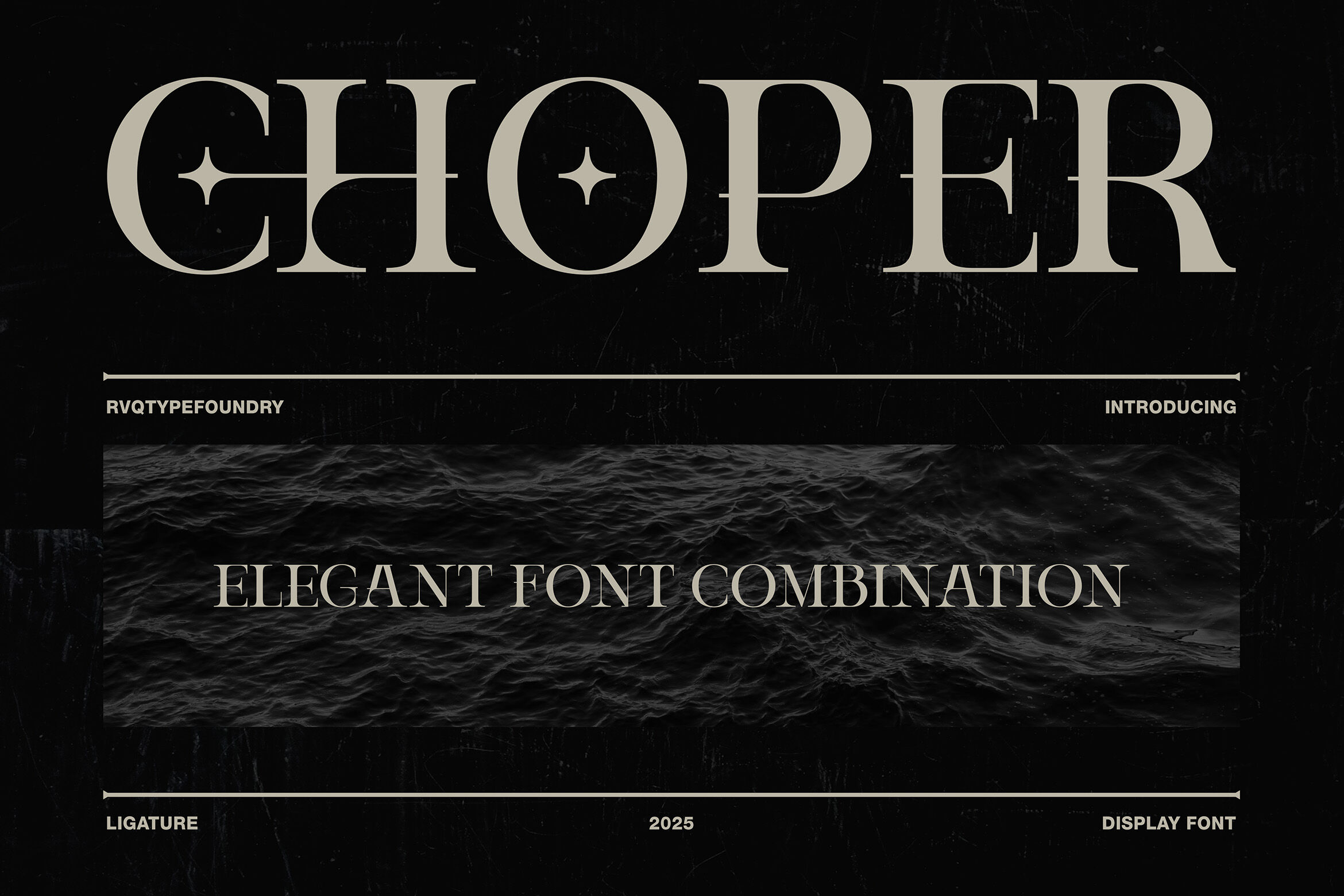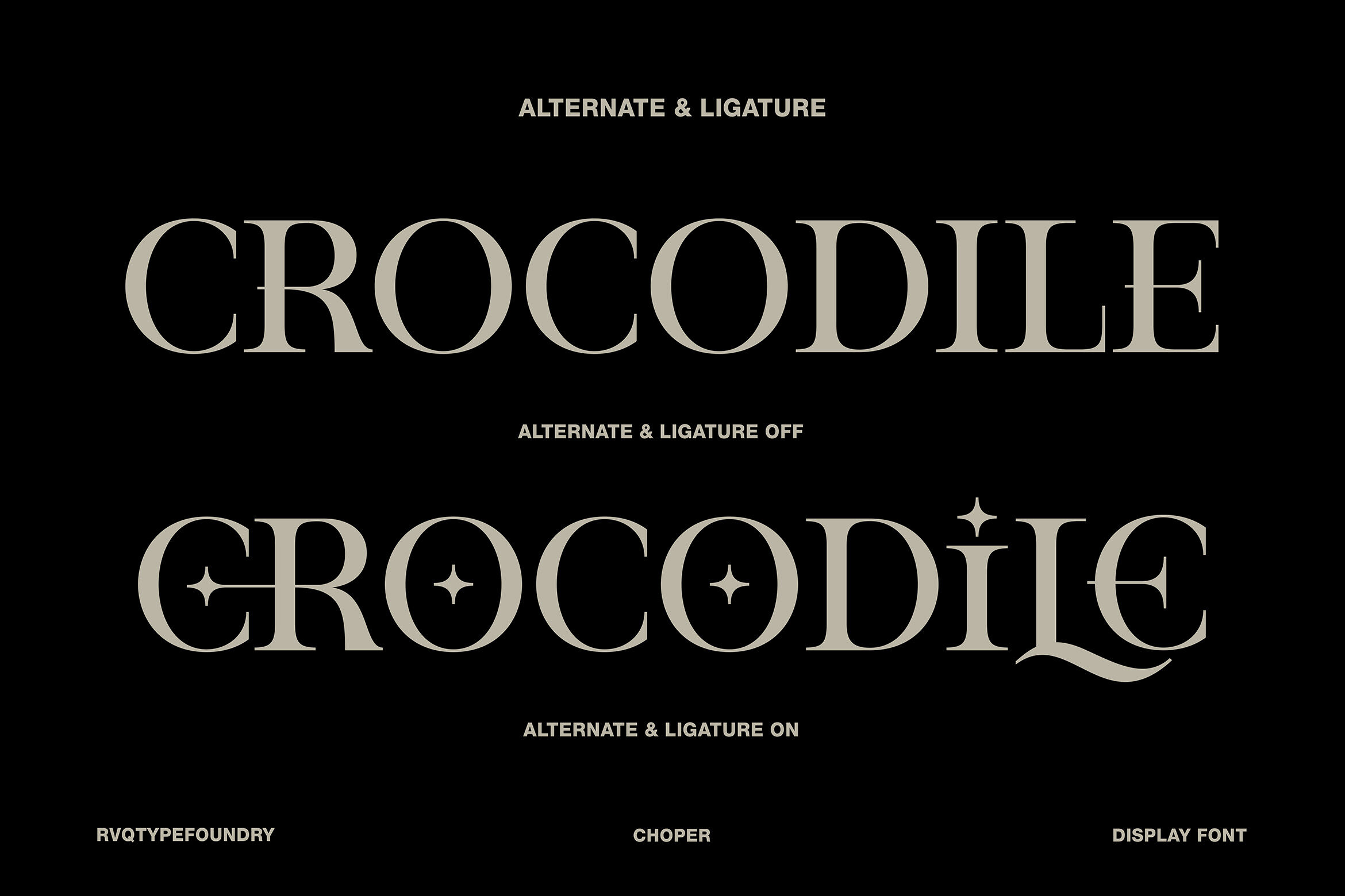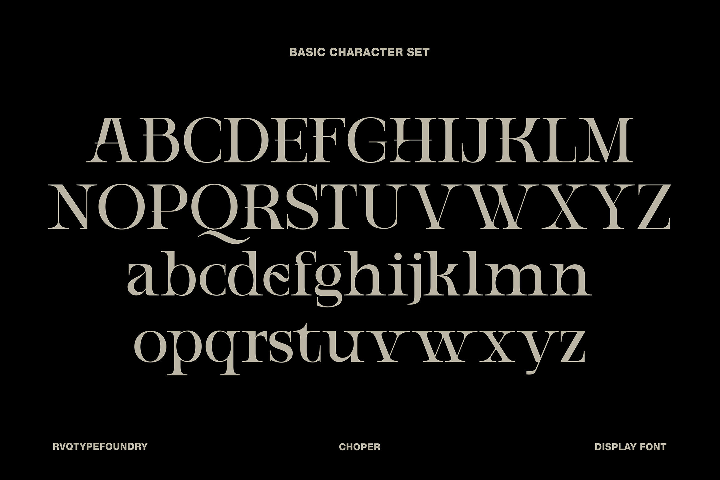 hoper Display is the new font from Rvq typefoundry ,was created as a dual-purpose font To create the beautiful combination, just mix your words with the alternative glyphs. Choper Display includes a full set of capital and lowercase letters, as well as multi-lingual support, currency figures, numerals, punctuation & some extra glyps. Perfect for : for Branding, Logos, Greeting Cards, Stationery Design, Invitations, T-shirts, Apparel, Packaging designs, Posters, Typographic Design, and so much more..