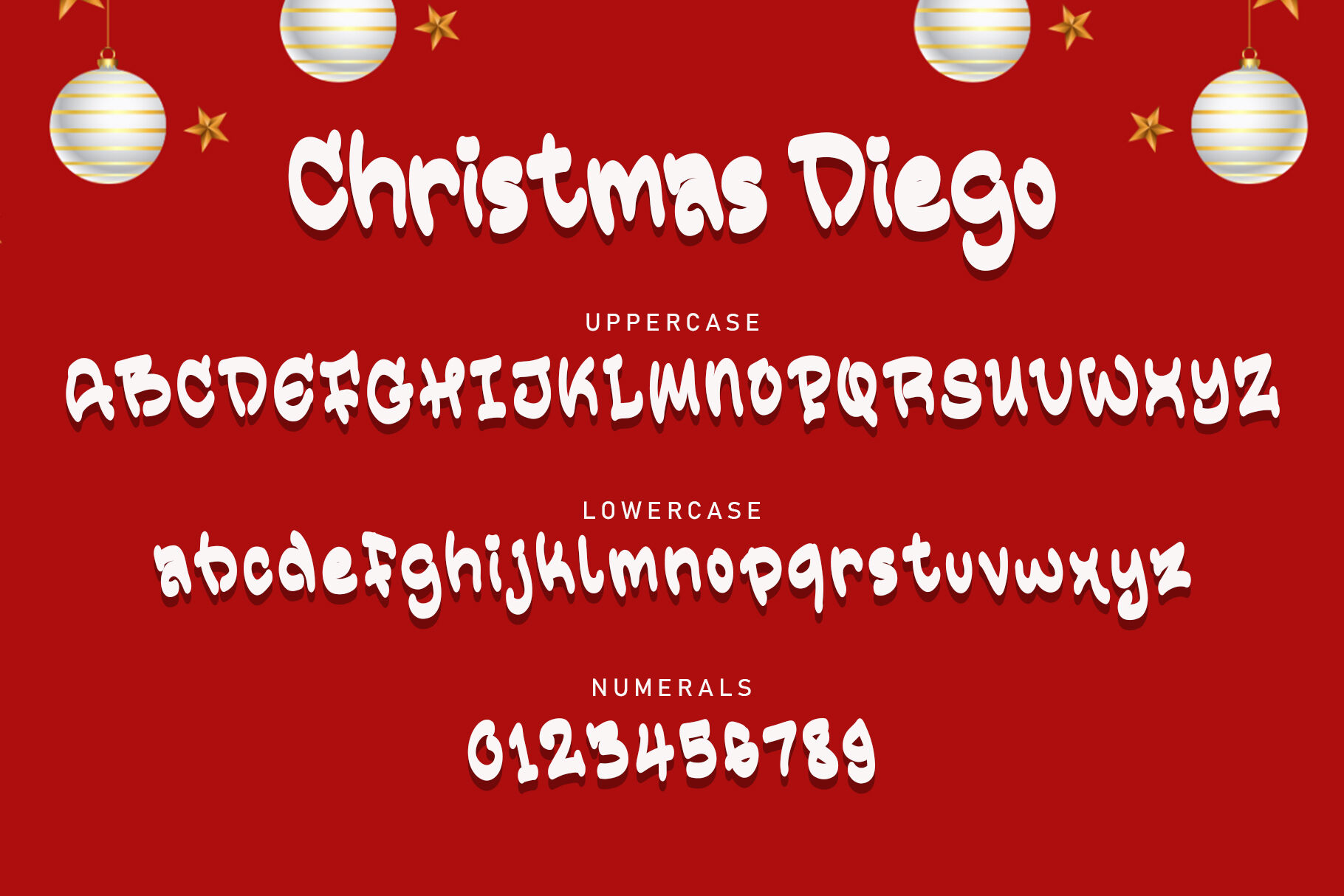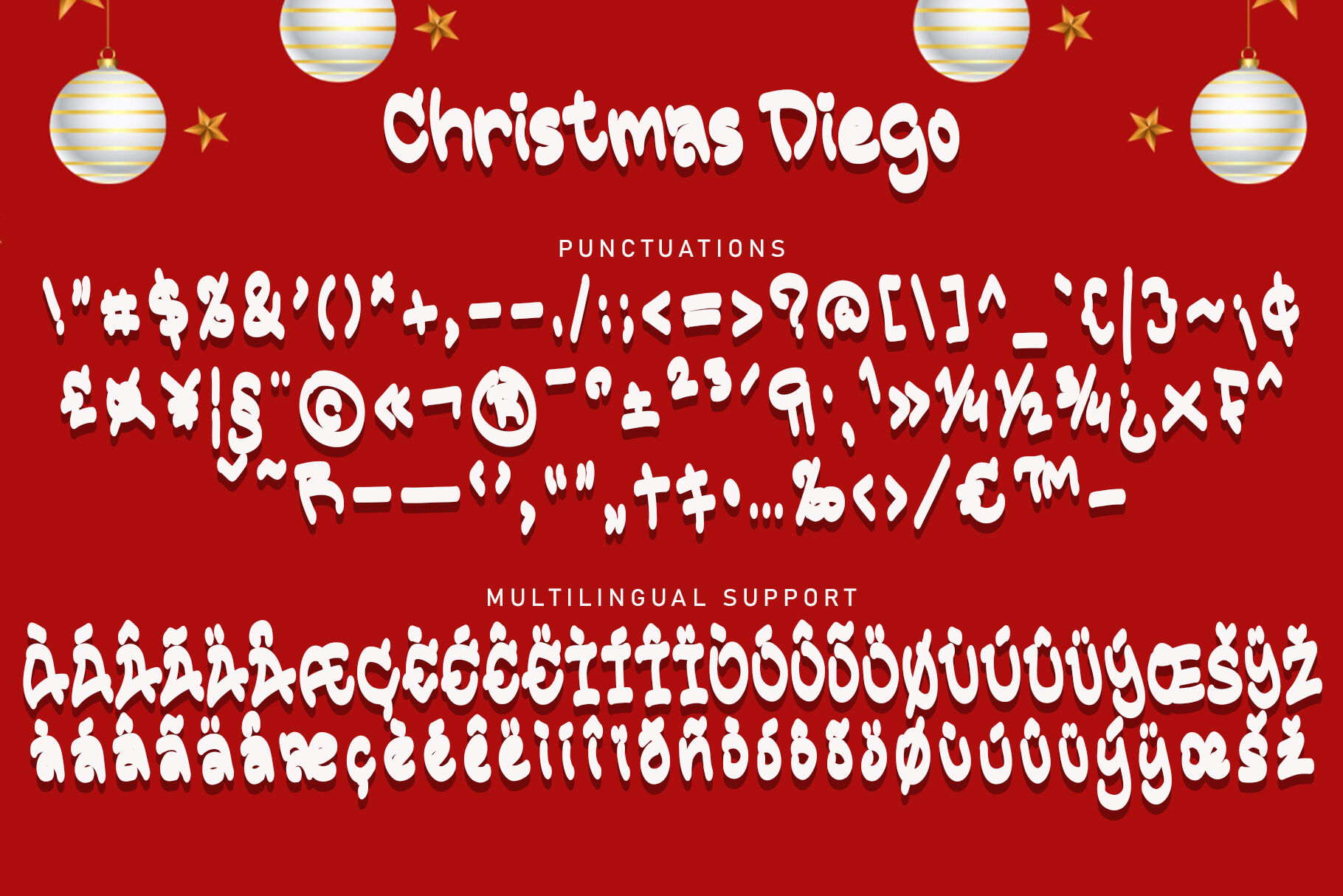 "Christmas Diego" is an elegant and unique display font. It features uppercase and lowercase letters, numbers, punctuation, and multilingual support. Perfect for banners, posters, prints, branding, logos, stickers, Christmas, graffiti, Halloween, winter, fall, gifts, birthdays, spring, summer, weddings, t-shirts, mockups, Procreate, sublimation, and more.