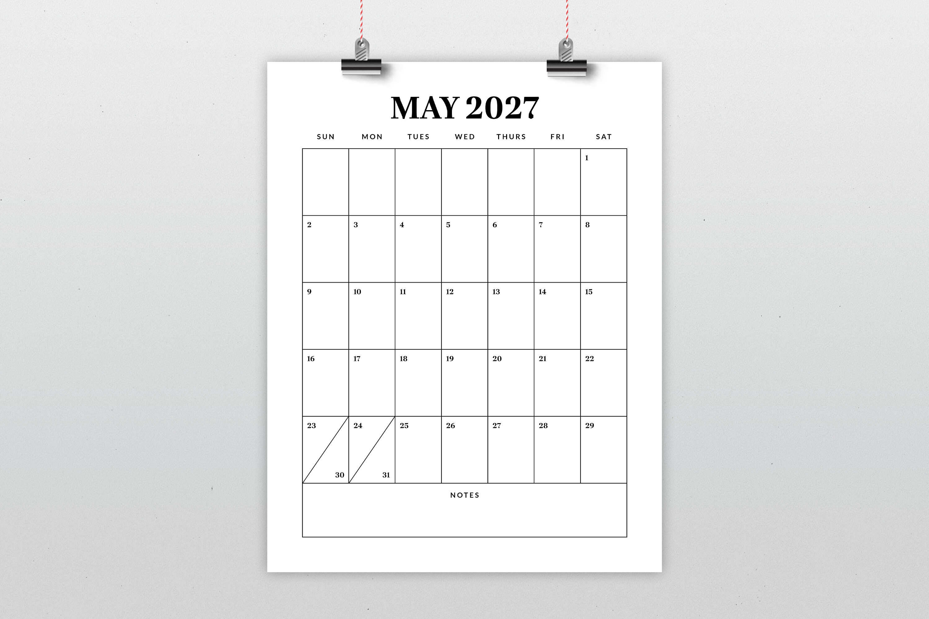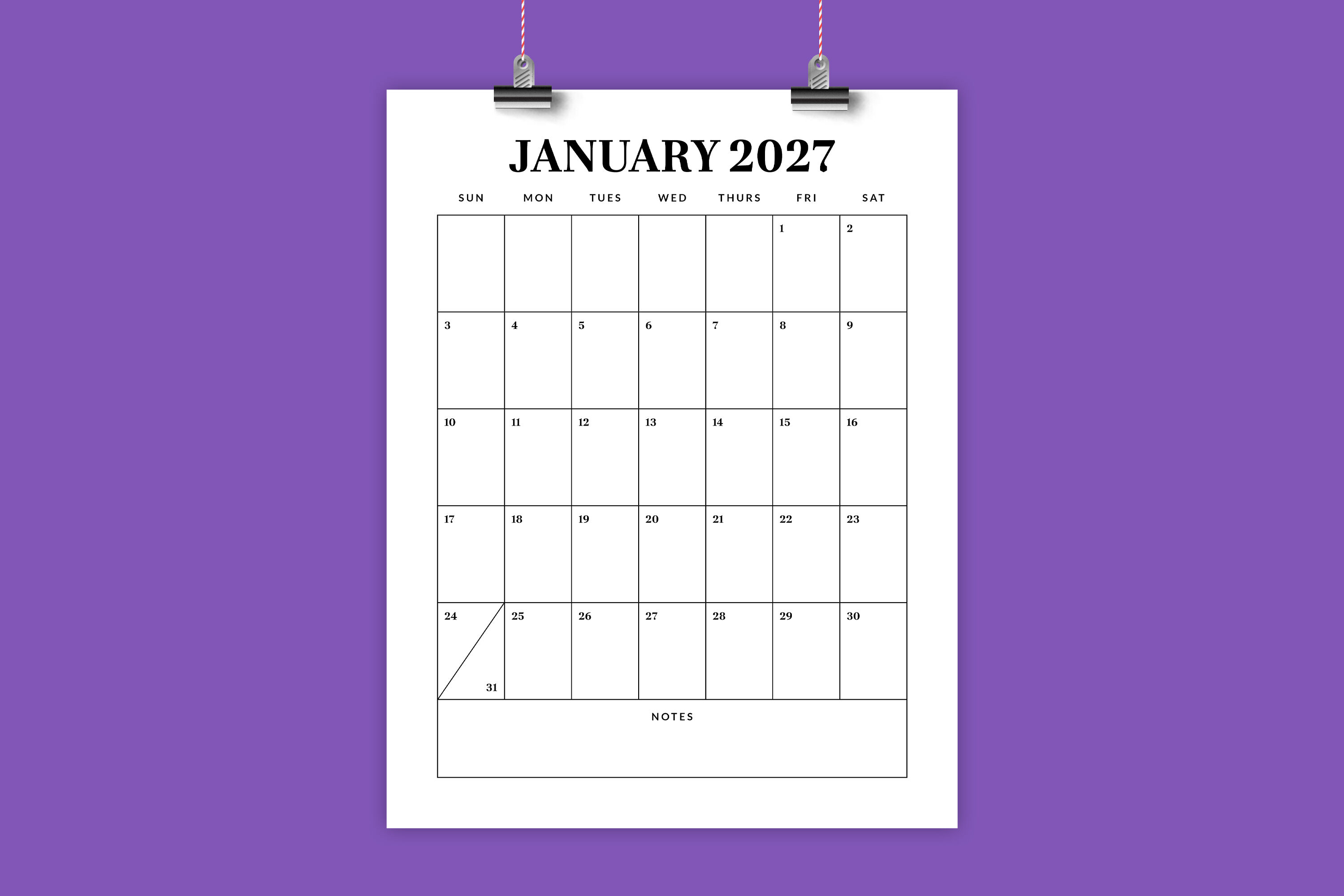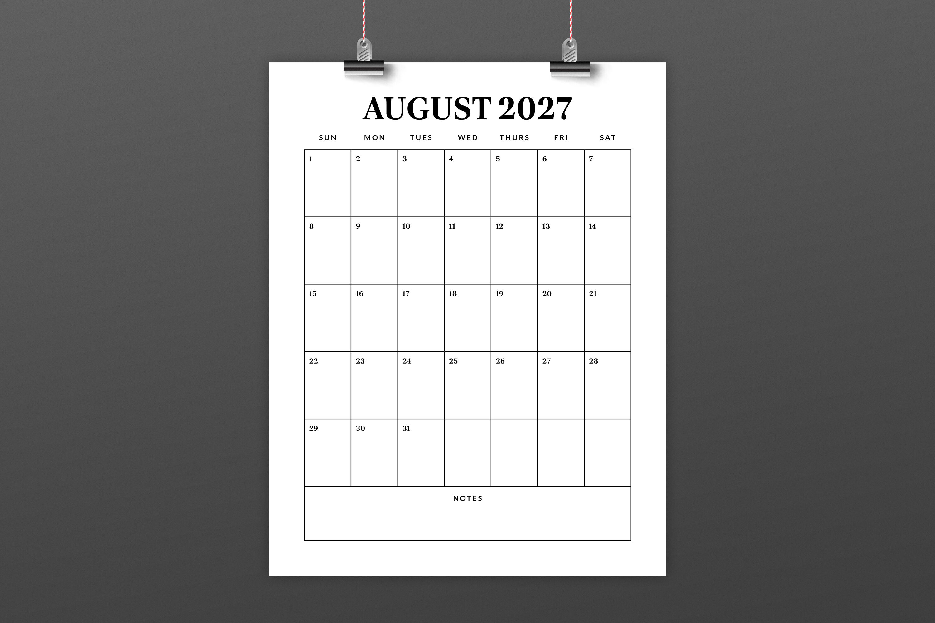 This listing is for a printable 8.5 x 11 inch vertical (portrait orientation) 2027 calendar template. Use as is, or add to it as needed! Perfect for home or office. Prints as 8.5" x 11" or less. Includes every month in 2027. • FILE TYPE: 12 individual printable high-res JPG and PDF files, transparent PNG files, a complete 12 page printable PDF, and the editable INDD file used to create the calendar. *Font files are not included, can be replaced with your own. • SIZE: Files are sized at 8.5 x 11 inches, 300 dpi, and can be printed as is or sized down.