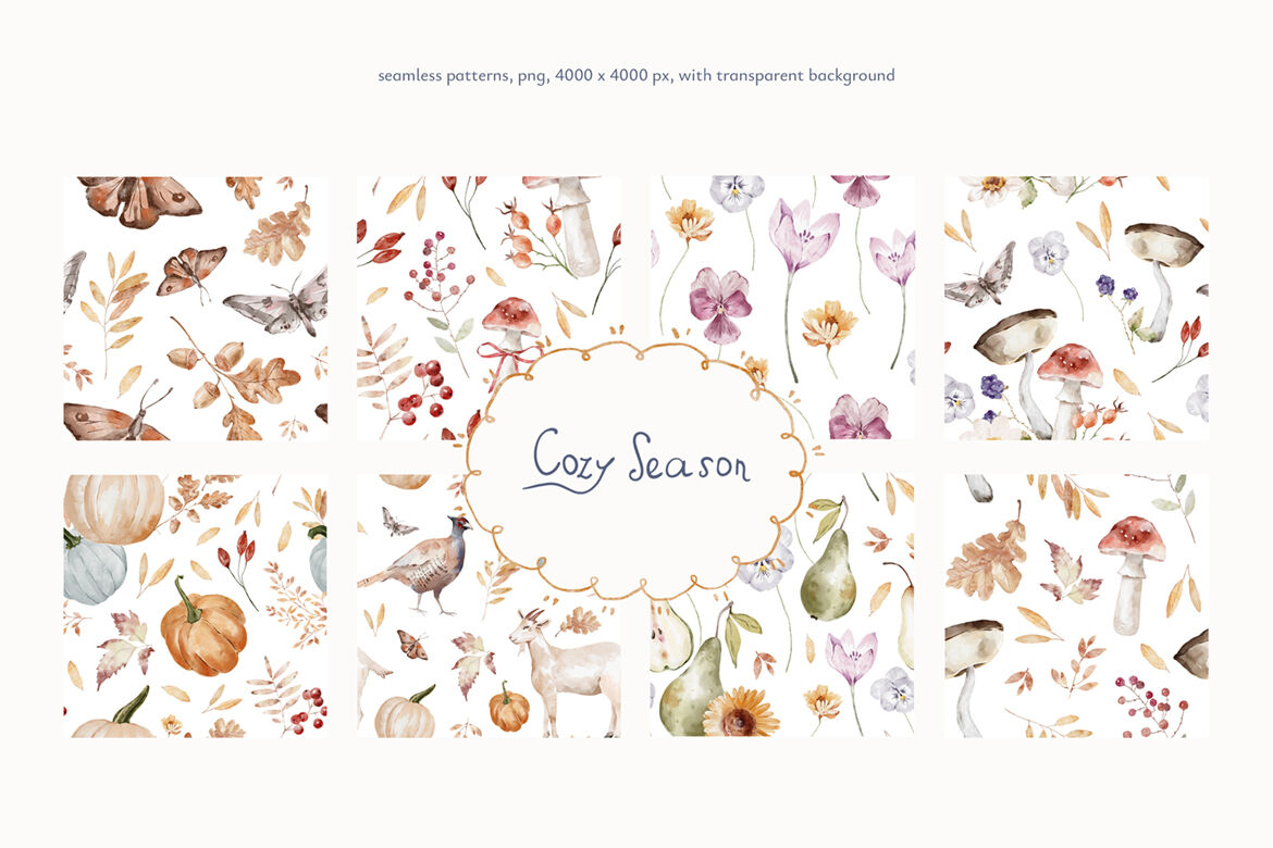 Cozy Season - a set of watercolor seamless patterns inspired by the magic of fall and the warmth of cottagecore aesthetics. Every element is hand-painted in watercolor will be a wonderful addition to your creative projects: invitations, greeting cards, packaging designs, wedding invitations, textiles, posters, gifts, stationery, moodboards, posters, wall art, stickers, textile design, decor and much more.   This set included: - 8 patterns, png, 300 dpi (4000x4000 px)