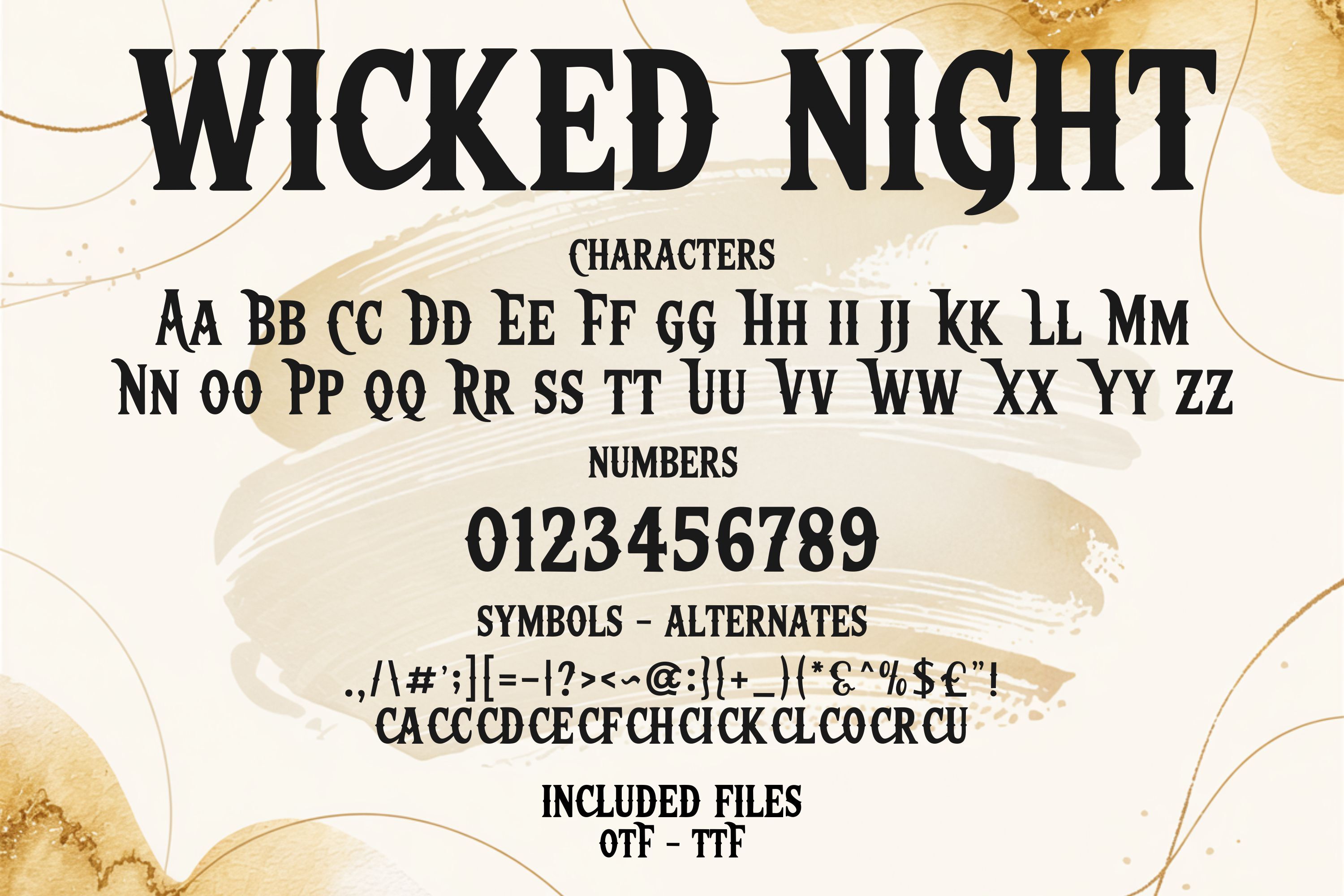 A standout feature? Its detailed glyphs, including uppercase and lowercase letters, numbers, punctuation, and alternates that give every word a hauntingly beautiful presence. Whether you’re designing fantasy book covers, dark aesthetic t-shirts, moody logos, or digital artwork, Wicked Night transforms ordinary text into a captivating visual statement.