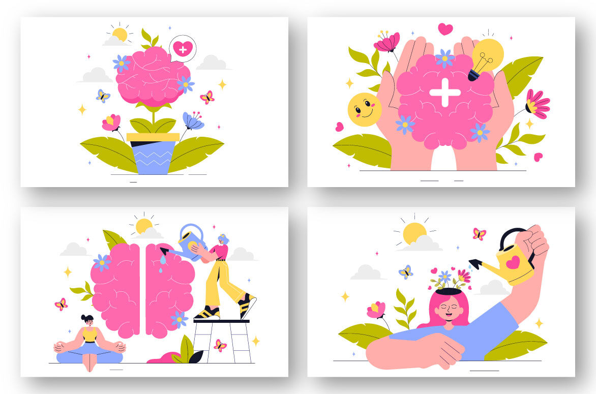 Mental Health Vector Illustration Featuring a Brain and Flowers, Symbolizing Enjoying Life, Solving Mental Problems, and Thinking Positively Suitable for Poster, Web Banner, Brochure, Landing Page and Others Background Template Features:    - Fully editable vector files, easy to edit the object, color and background     - Include 100% vector Ai, Eps 10, SVG    - PNG transparent background    - Include Psd Photoshop ( non grouped / unlabeled )    - Layered    - Preview jpeg    - Help File, to view more file properties    - Enjoy and don't hesitate to contact us    - Thanks :-)