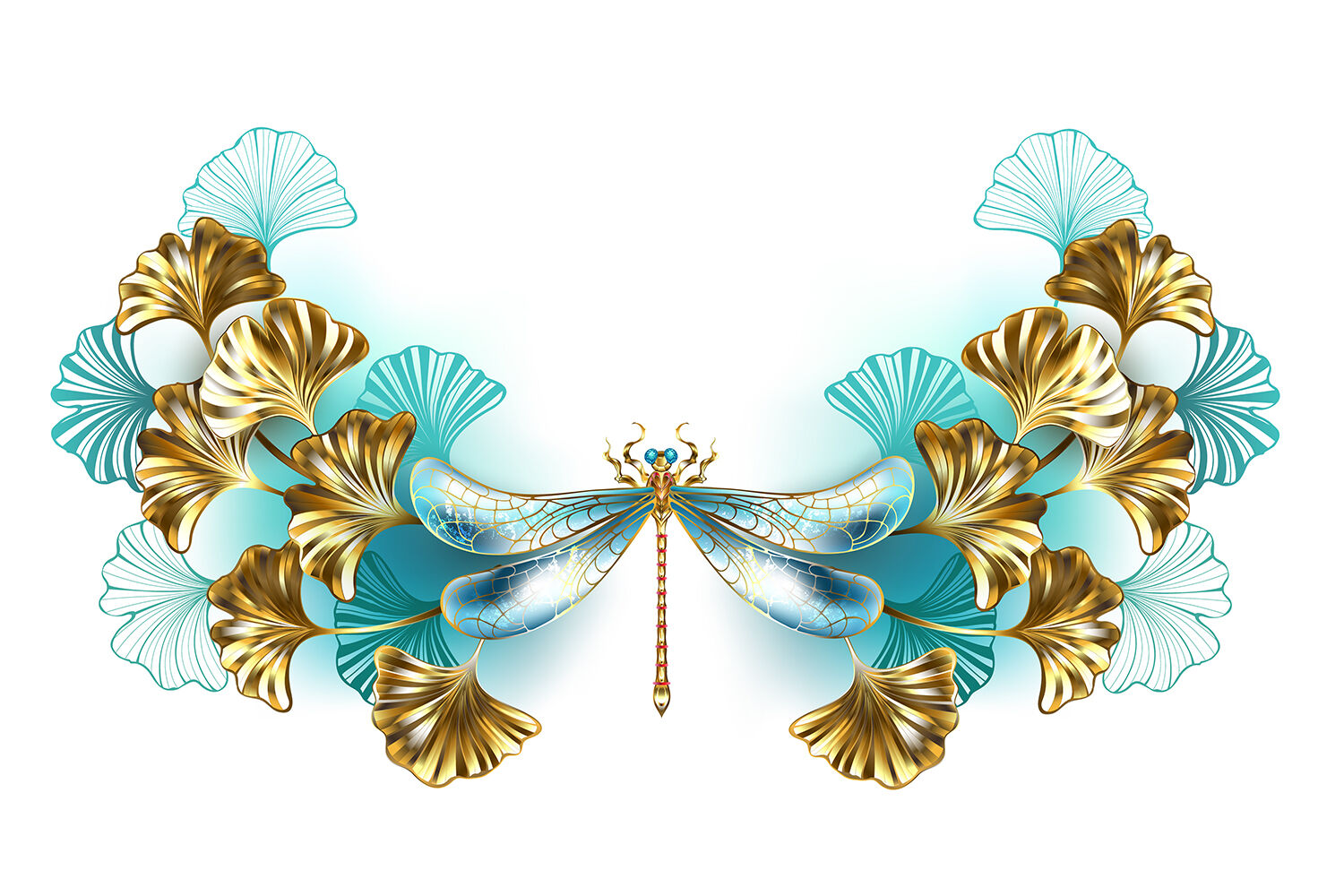 Symmetrical frame of Ginkgo biloba branches with gold and turquoise leaves, decorated with gold jewelry dragonfly on white background. Golden dragonfly. Zip file includes editable EPS + high quality render in JPG format.