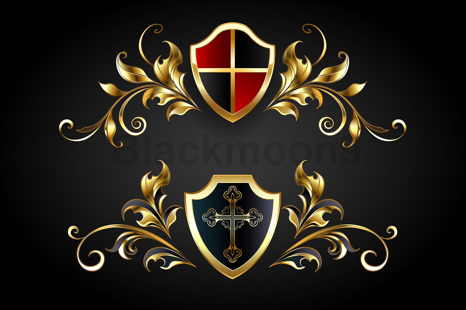 Luxurious, symmetrical, artistically drawn, jewelry frame made of shiny gold with knight heraldic shield on black background. Medieval luxury. Zip file includes editable EPS, PNG (transparent background, each separately) + high quality render in JPG format.