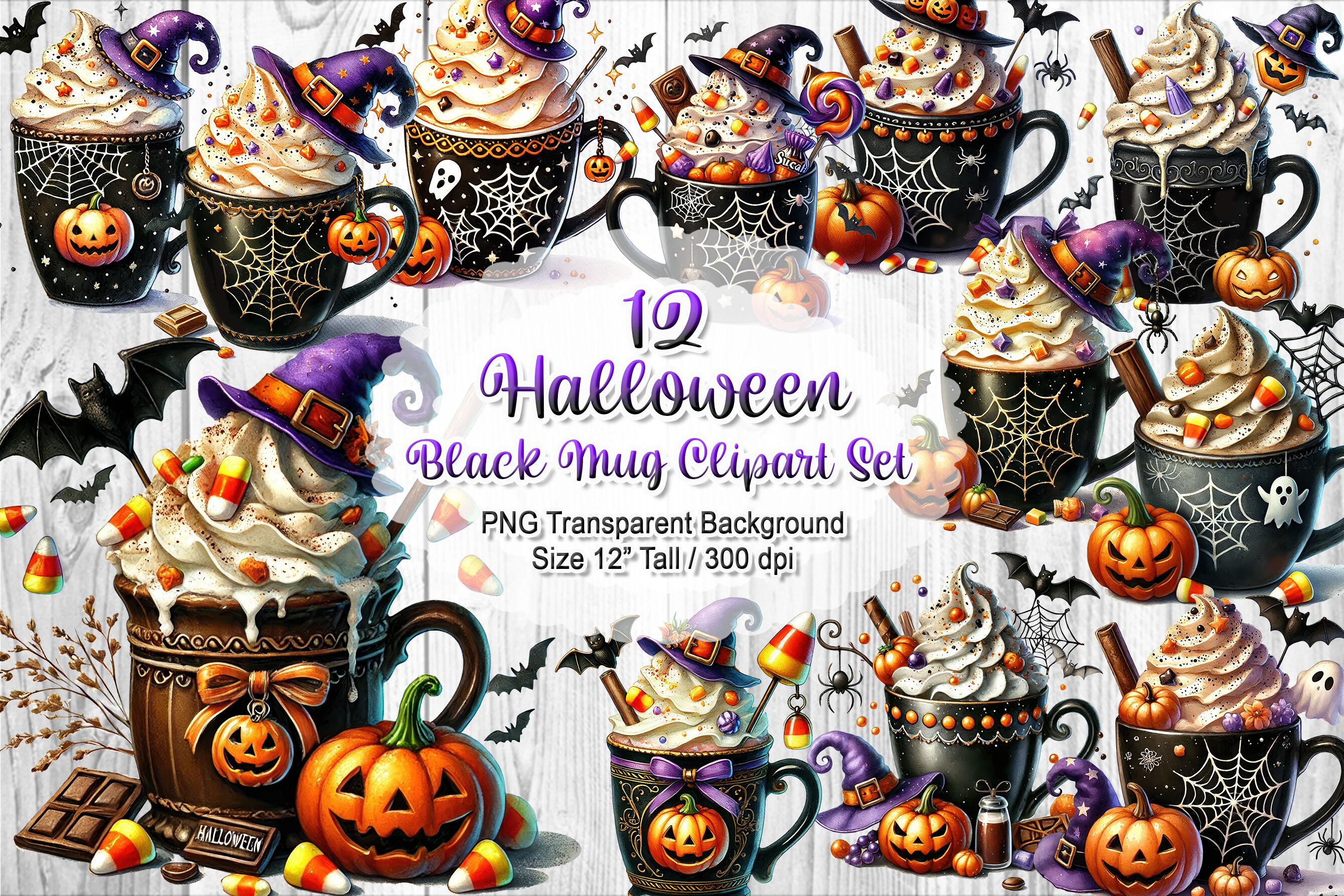 Add a cozy spooky touch to your Halloween designs! This clipart set includes 12 high-quality PNG images of Halloween-themed black mugs filled with whipped cream, decorated with Jack-o’-lantern faces, bats, pumpkins, straws, and spider webs. Perfect for junk journals, sublimation projects, planner stickers, party invitations, and more. – 12 PNG files with transparent background – Size: 12 inches tall each design – Resolution: 300 DPI – Clean edges, hand-painted watercolor style – Halloween theme: cozy, cute, and festive! Use them for t-shirts, mugs, tumblers, stickers, and printable projects to instantly add a whimsical Halloween vibe.