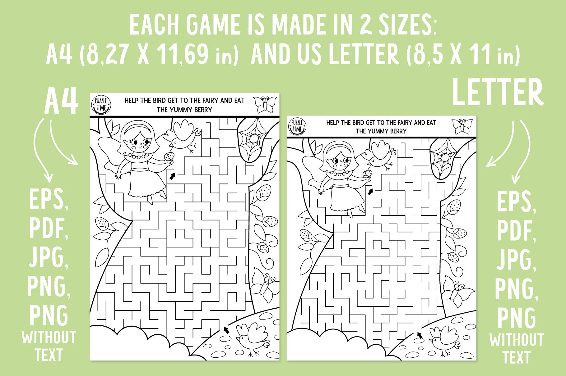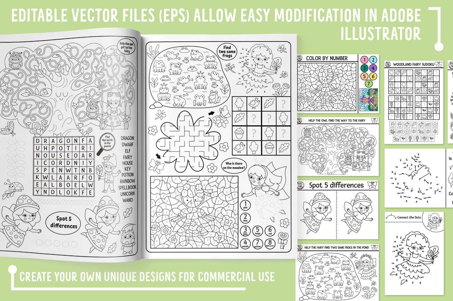 The product consists of the most popular coloring activity types for children: mazes, board games, seek and find games, dot-to-dots, color by numbers, crossword and word search puzzles, matching and counting activities (including shadow match), difference searching, writing and drawing practice worksheets. The games are made in 2 formats: A4 (8,27 x 11,69 inches) and US Letter (8,5 x 11 inches). All the games are originally vector, so you can modify them, change size, elements and recolor. The text is easily editable in Adobe illustrator. Just open it in the program and replace with your own. In png files white background is changed to transparent.