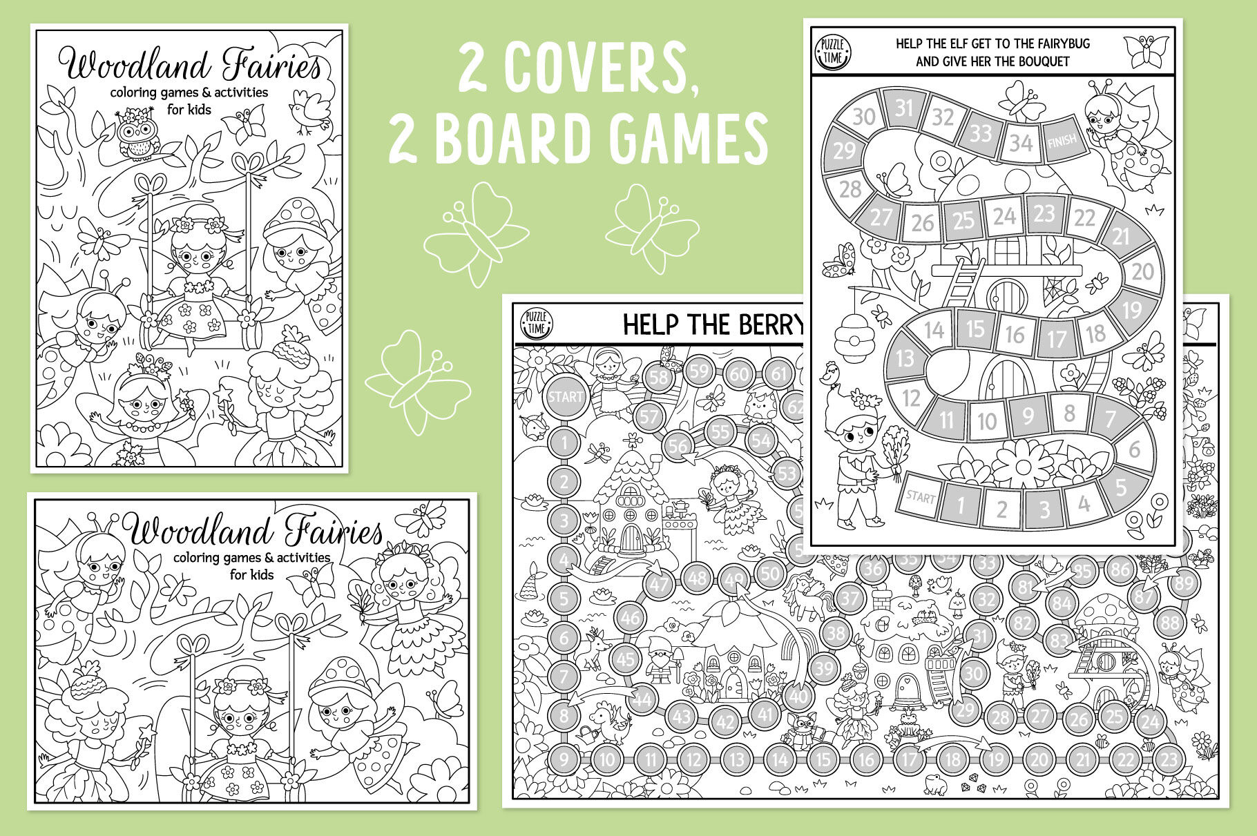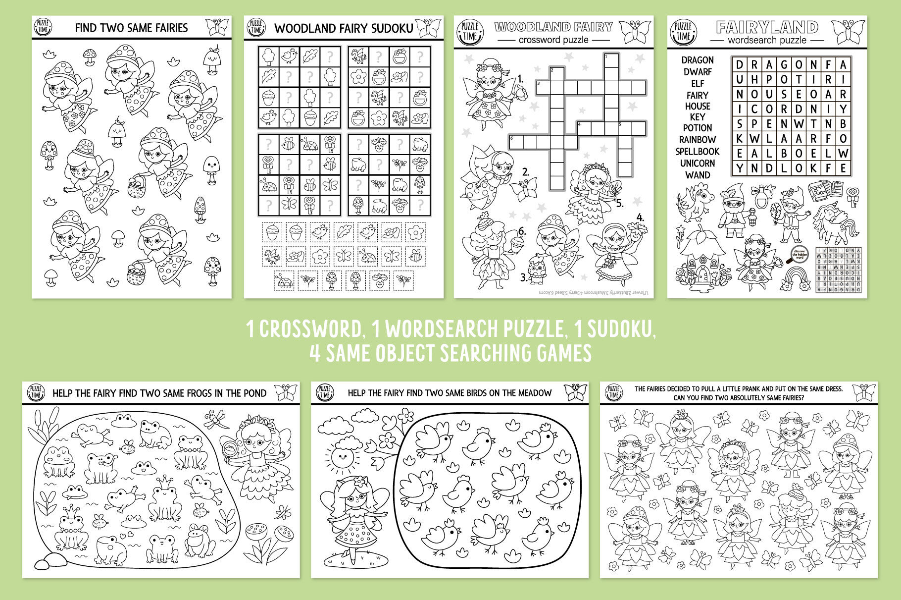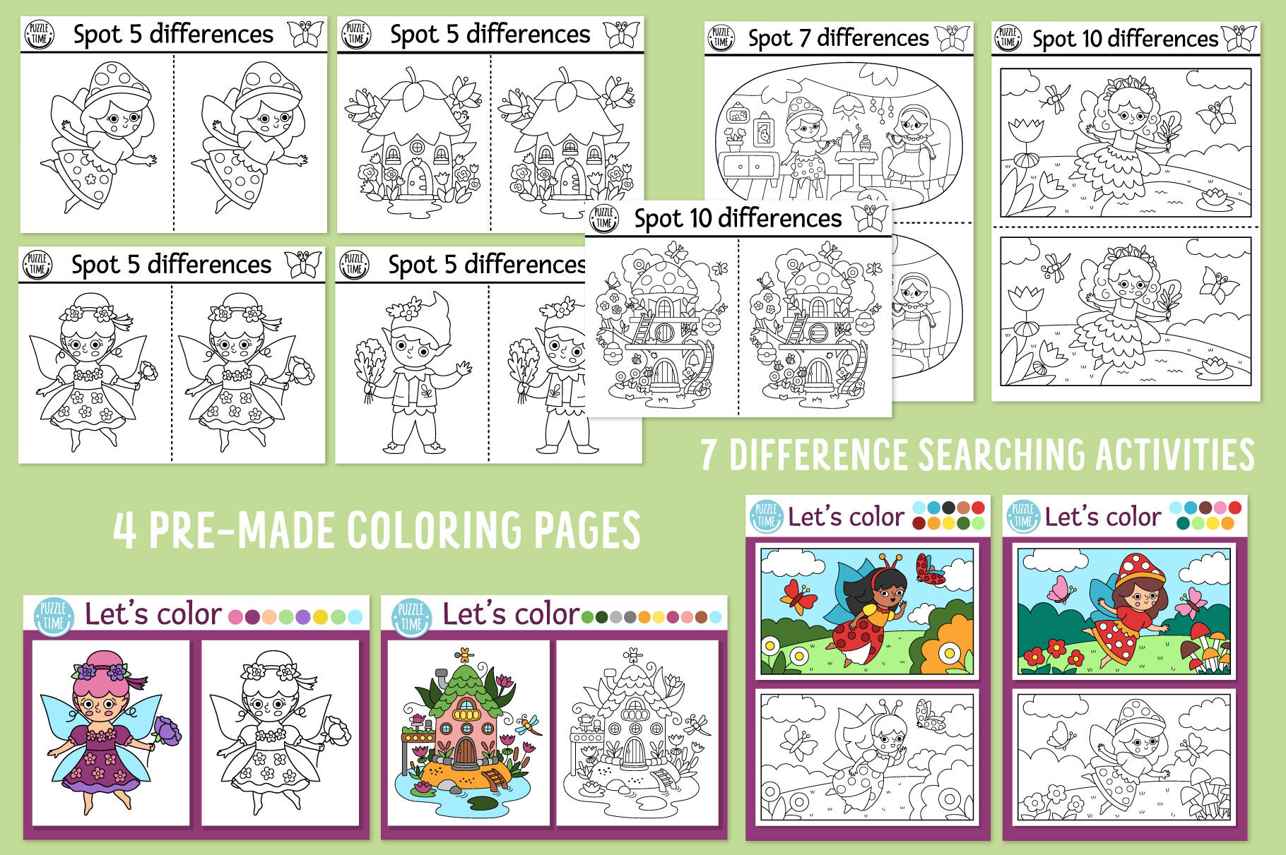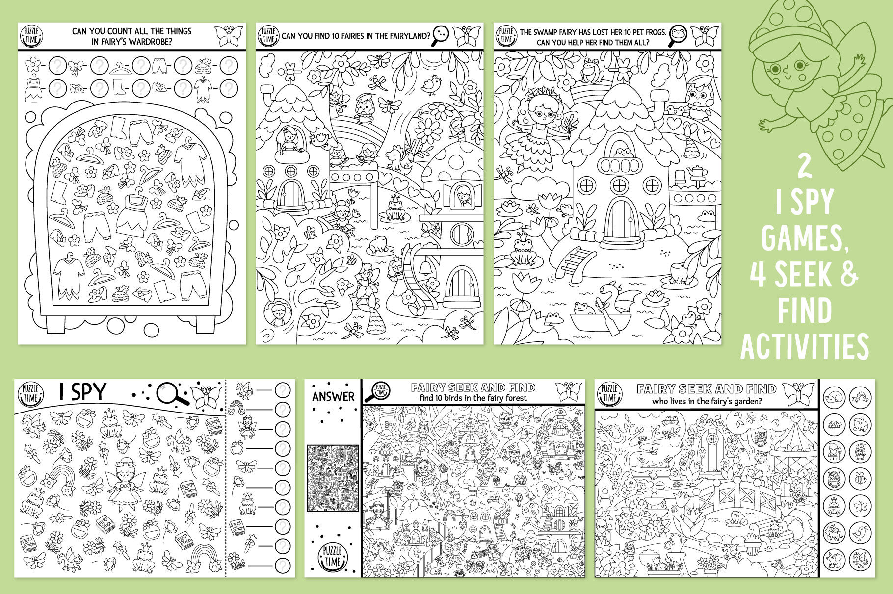 Meet my Woodland Fairy coloring games and activities for kids. This pack includes cute fairy girls, elf, unicorn, dwarf, fantasy forest creatures and lots of other fairytale characters. Cute mushroom and tree houses, enchanted garden: in this pack you’ll find everything to submerge in the wonderful magic atmosphere. These games are perfect for a princess party or just as a fun activity kit to get kids busy. You can create your own magic self-publishing books: it’s extremely easy to combine the games, making your own unique product. These activities can also be used to create family bonding moments or as an original and memorable gift. Have fun!