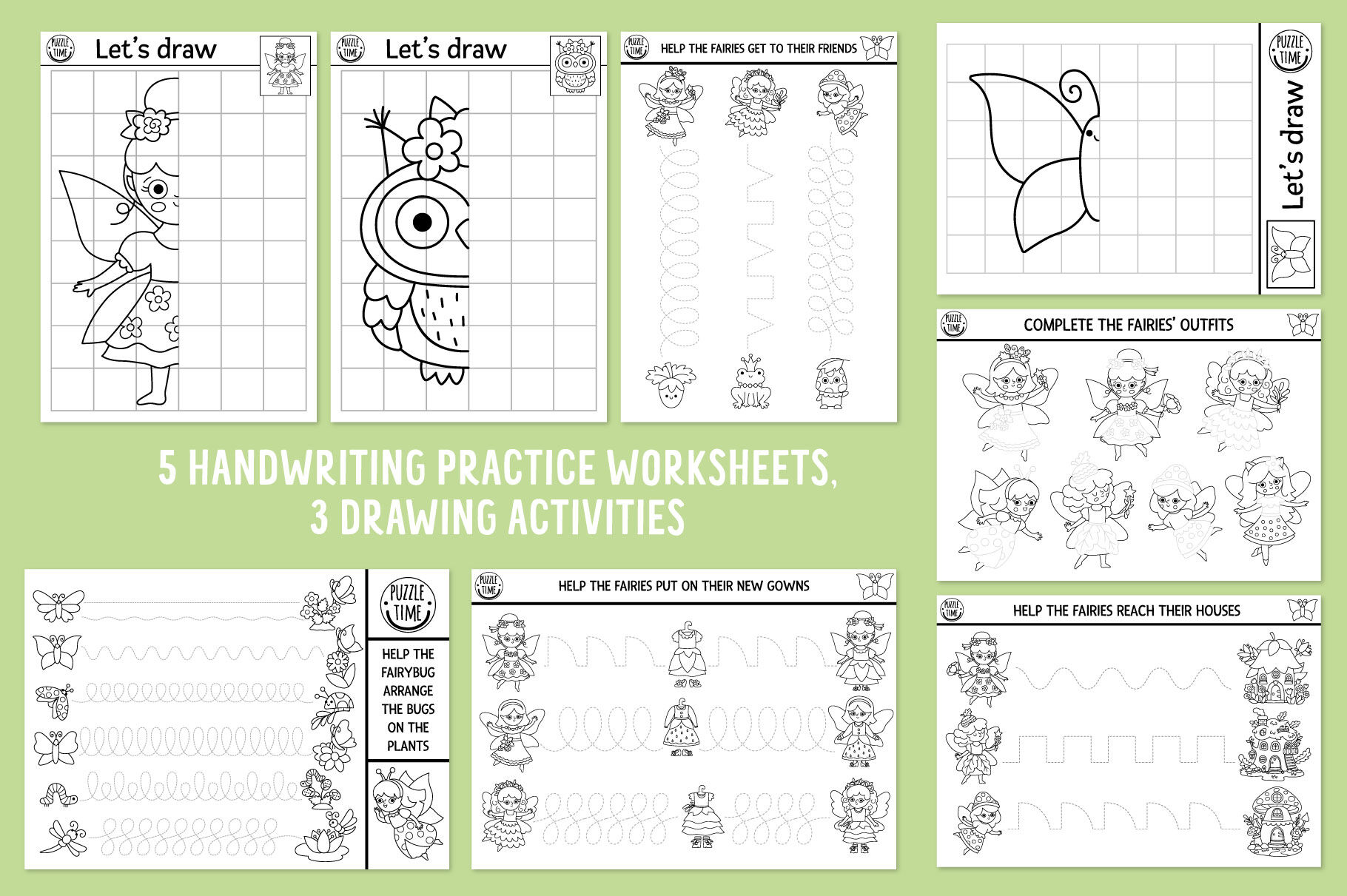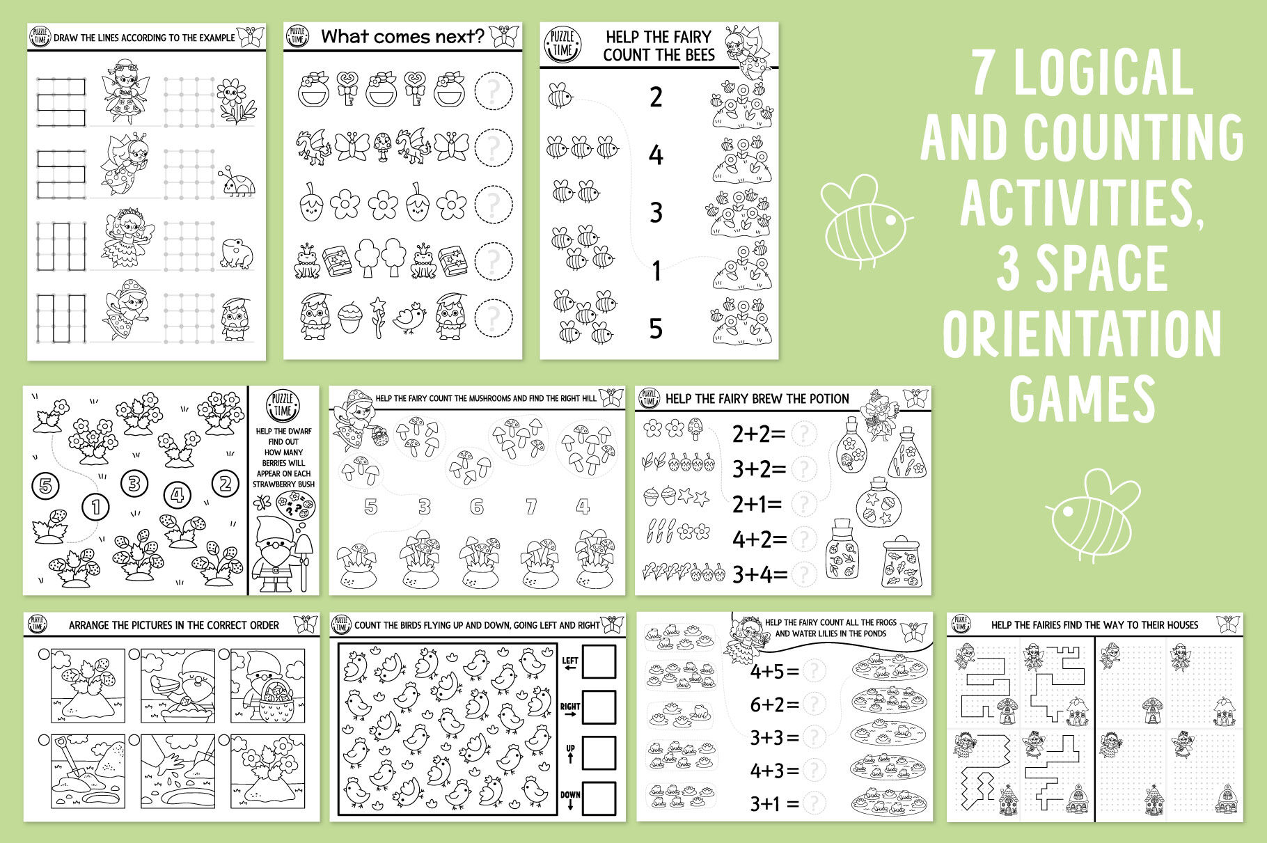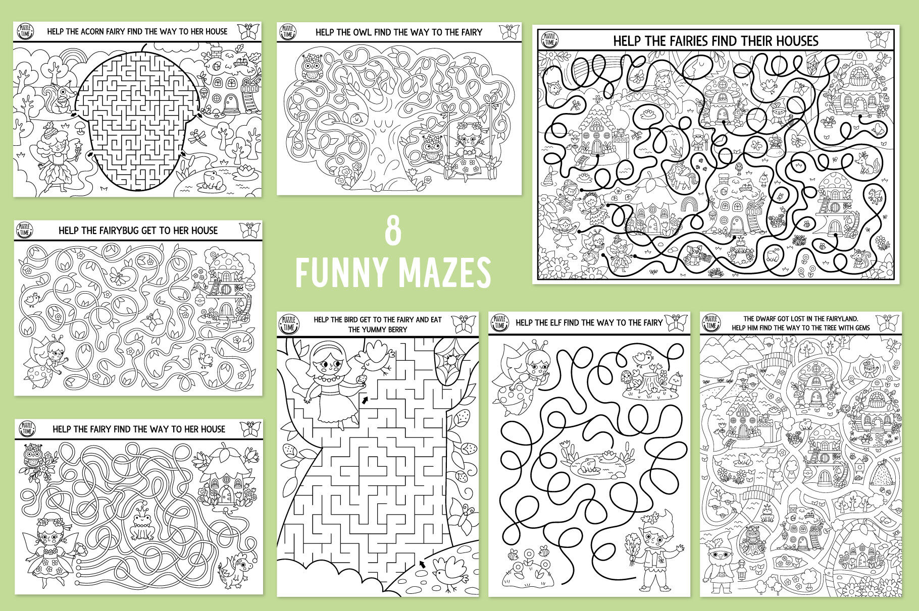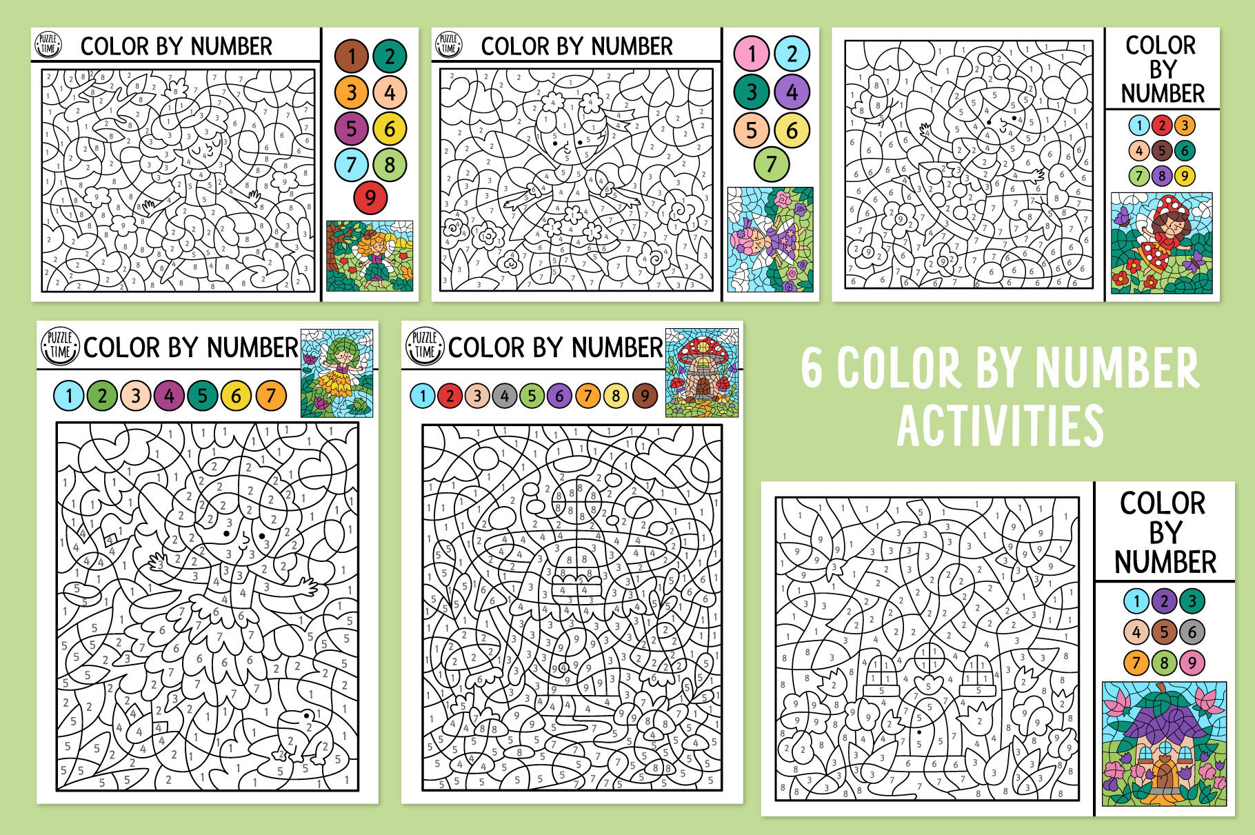 Meet my Woodland Fairy coloring games and activities for kids. This pack includes cute fairy girls, elf, unicorn, dwarf, fantasy forest creatures and lots of other fairytale characters. Cute mushroom and tree houses, enchanted garden: in this pack you’ll find everything to submerge in the wonderful magic atmosphere. These games are perfect for a princess party or just as a fun activity kit to get kids busy. You can create your own magic self-publishing books: it’s extremely easy to combine the games, making your own unique product. These activities can also be used to create family bonding moments or as an original and memorable gift. Have fun!