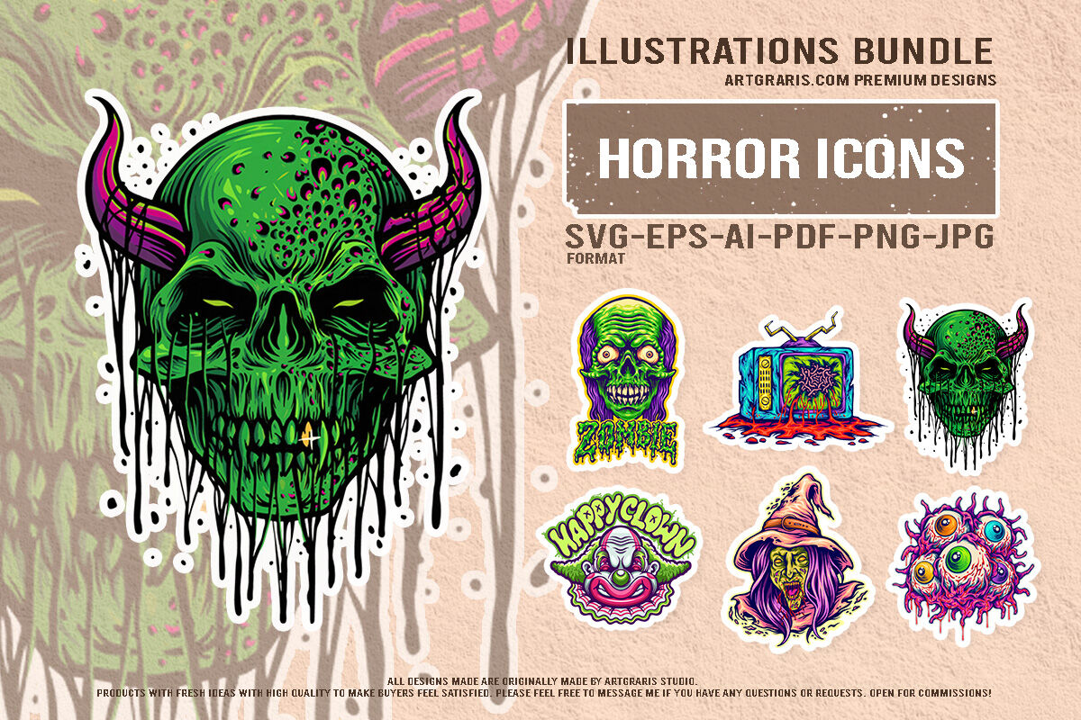 Vector illustration Horror Freak Zombie Clown Witch Skull Monster suitable for various purposes, such as Illustration on Merchandise T-shirts, Tote Bags, stickers, banners or Decorations, greeting, Postcards, flyers, posters, and other design products. Features: – Compatible with AI (Adobe Illustrator) – 100% Editable Vector and Master Files (AI) – High quality – Easy to edit – Ready to EPS file – Ready AI files – Ready PDF files – Ready to SVG files – Ready PNG files (are high resolution 300 dpi and on transparent background) 100% vector, editable color, ready print. Thank you for your purchase, do not forget to rate.