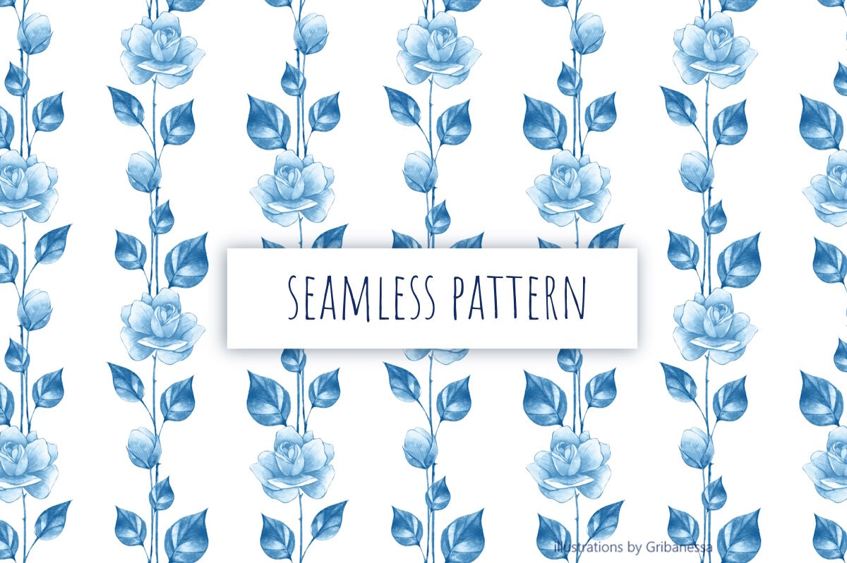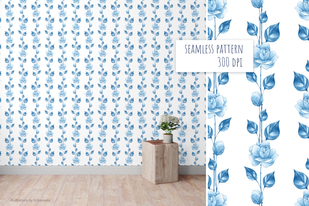 An elegant and continuous watercolor seamless pattern featuring delicate blue roses and foliage on a clean white background. This high-quality hand-painted JPG digital paper is ideal for fabric printing, luxury gift wrapping, sophisticated wedding stationery, and romantic home decor. Product Details: 1 JPG file with seamless pattern, 3600 x 3600 pixels, High resolution 300 DPI. Happy creating!