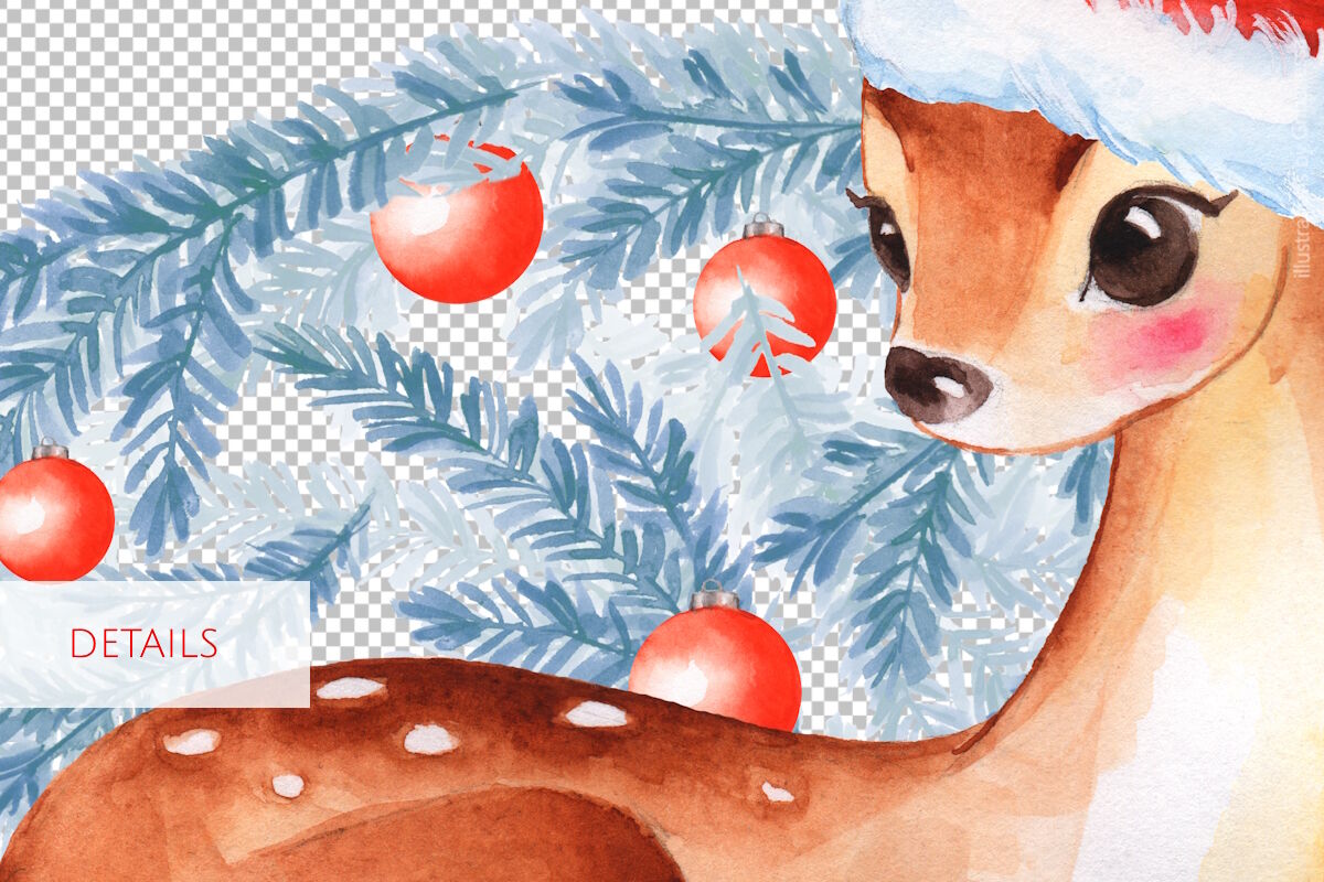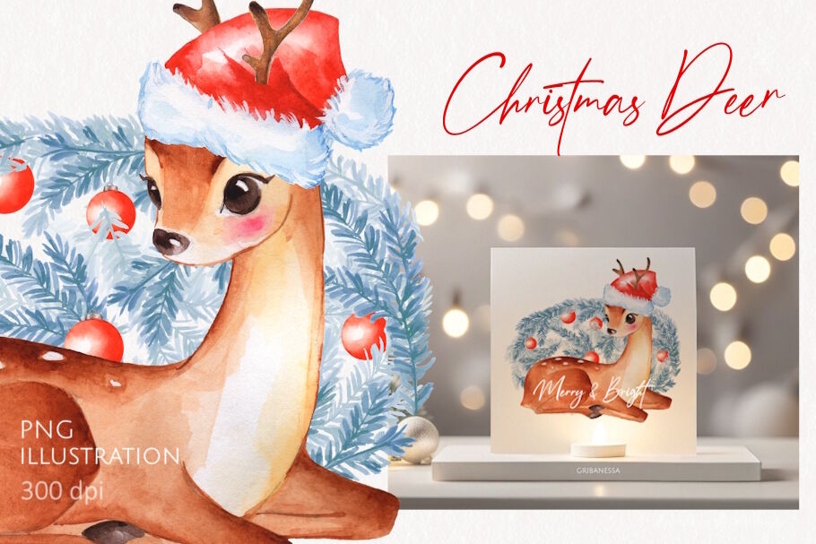 High-quality, transparent PNG illustration of a charming baby deer wearing a Santa hat and surrounded by a winter wreath. This beautiful hand-painted element is ideal for creating custom holiday cards, apparel, mugs, and Christmas decor that requires a whimsical, cozy touch. Product Details: 1 PNG file on transparent background, 3000 px on the longest side, High resolution 300 DPI. May this charming illustration bring you joy!