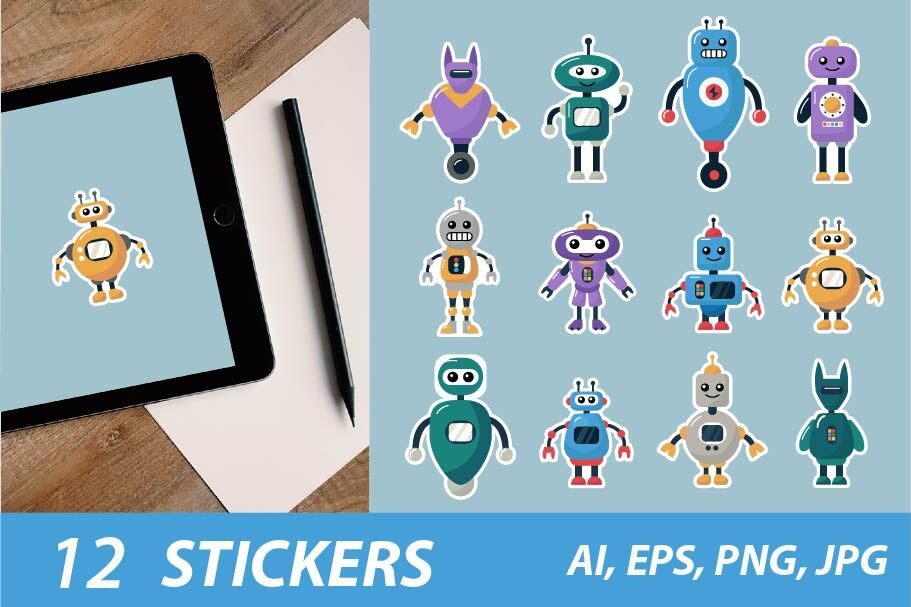 I am pleased to present you my collection. This collection: Robots stickers, includes 6 stickers are perfect for your planner, laptop stickers, scrapbooking, card making, decoration and many more projects. You will receive: 1.  Folder CRICUT_SILHOUETTE - Included ready to print 2 files PNG/JPG with all stickers and 1 PNG file with silhouettes for Silhouette Studio 2.  Folder HAND CUT - Included ready to print 2 files PNG/JPG, all stickers with hand cut lines 3.  Folder INDIVIDUALLY - including all 12 stickers individually PNG/JPG (files with transparent background 300 dpi) 4.  Folder VECTOR - Included 1 EPS and 1 AI files. Easy to edit and resize ** This is a digital file and no physical item will be shipped ** Thanks for stopping by!