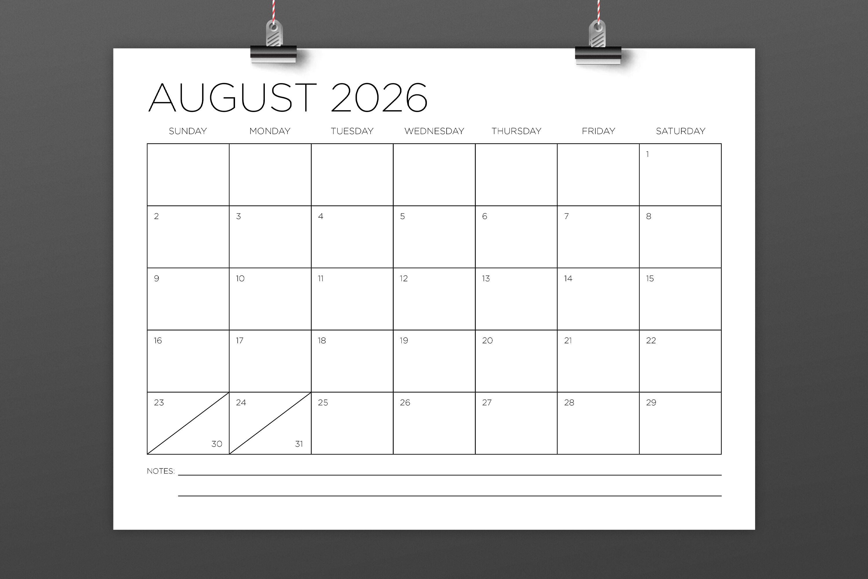 2026 12 x 9 Thin Sans Serif Calendar Template