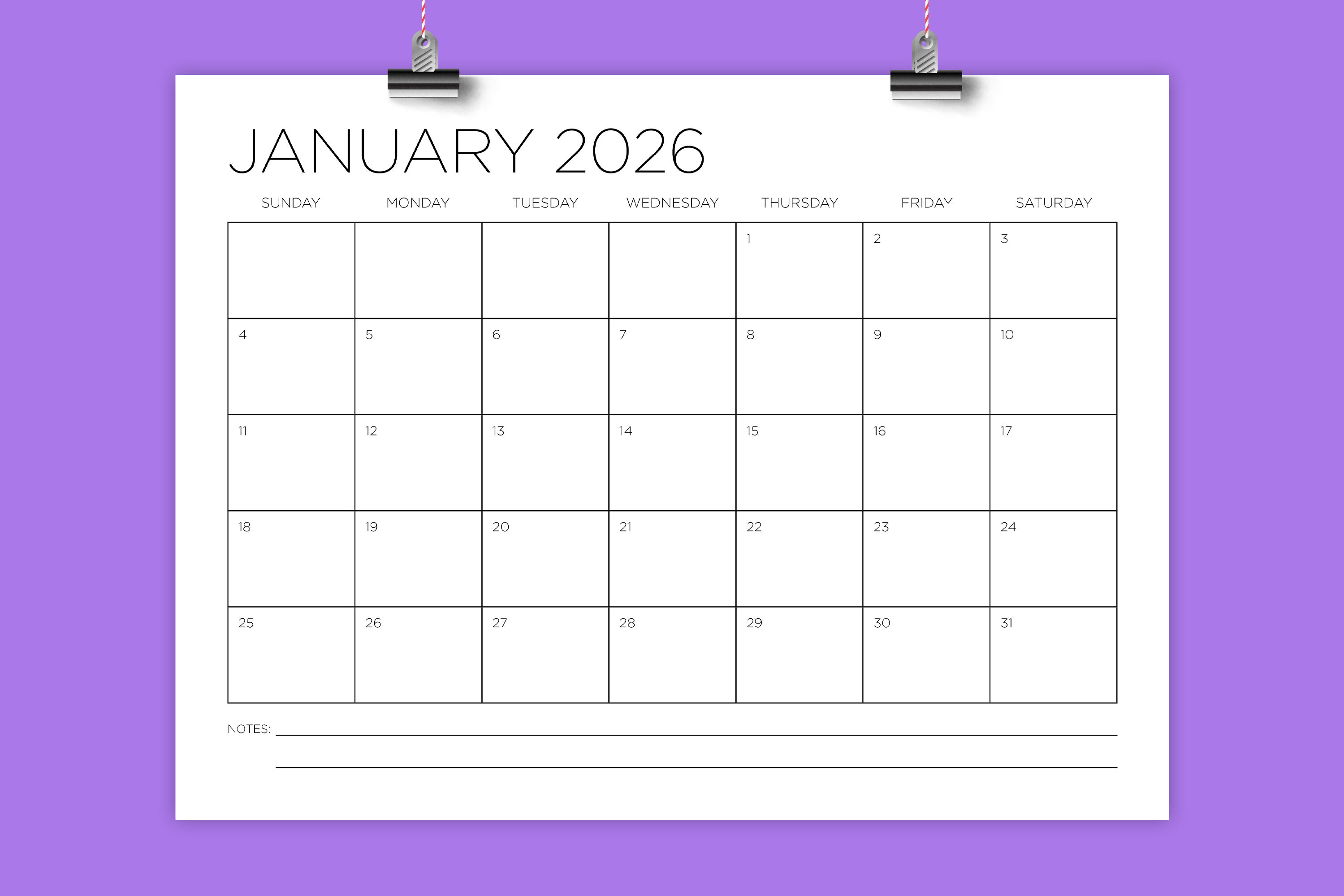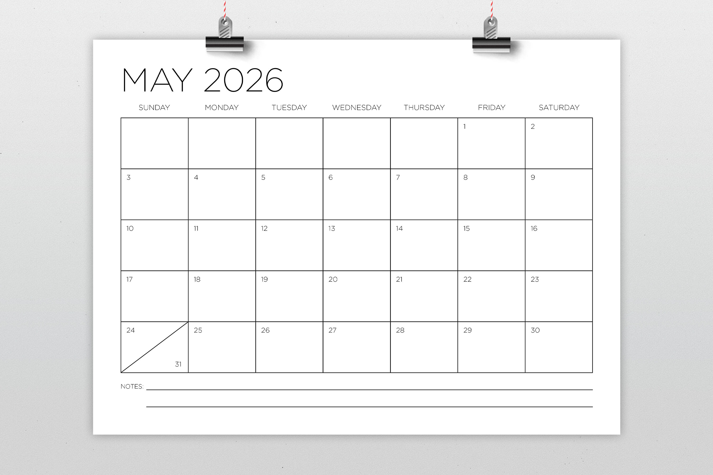 This listing is for a printable 2026 calendar template. Use as is, or add to it as needed! Perfect for home or office. Prints as 12" x 9" (horizontal) or smaller. Includes every month in 2026.  FILE TYPE: 12 individual printable high-res JPG and PDF files, transparent PNG files, a complete 12 page printable PDF, and the editable INDD file used to create the calendar. *Font files are not included, can be replaced with your own. SIZE: Files are sized at 12 x 9 inches, 300 dpi, and can be printed as is or sized down.