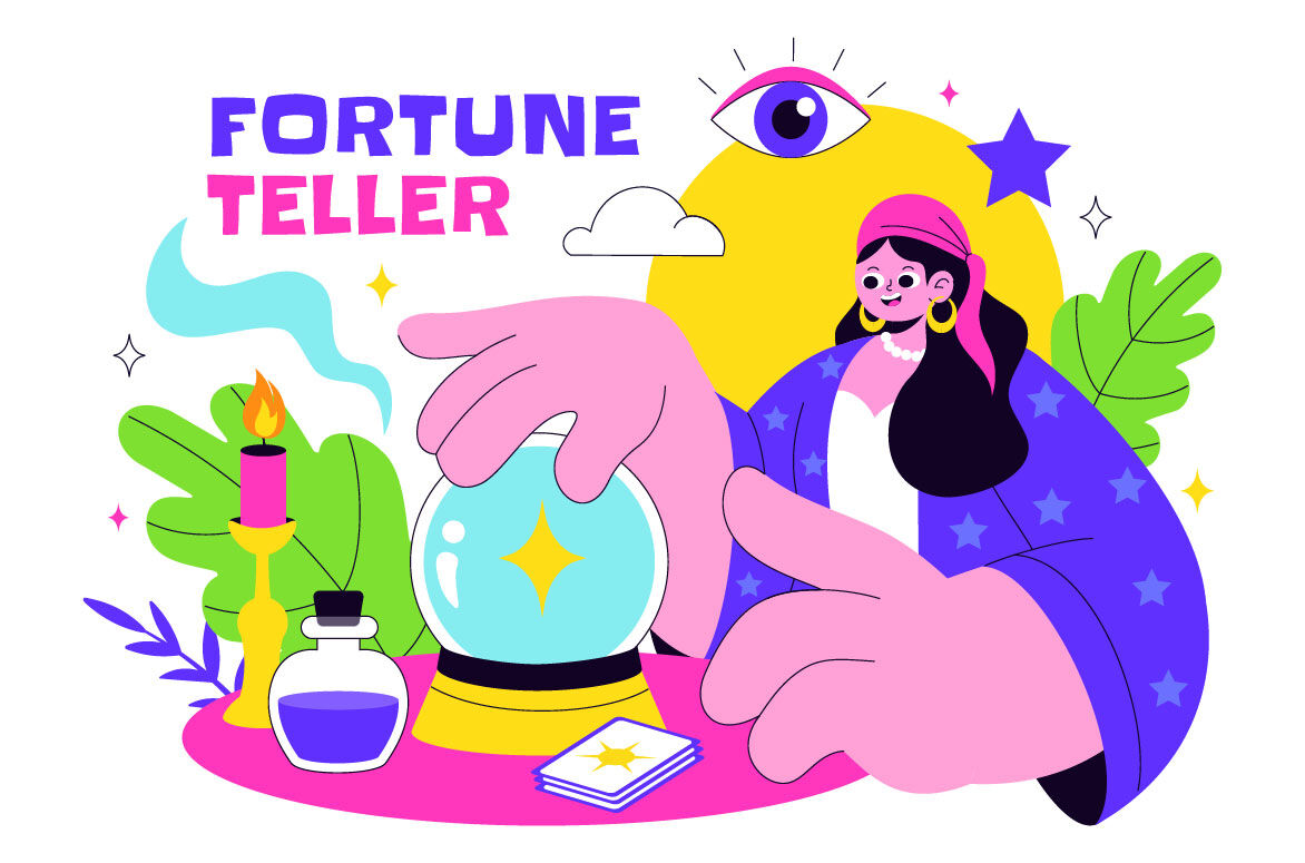 Fortune Teller Vector Illustration with Crystal Ball, Magic Book, and Tarot Cards for Predicting Destiny and Telling the Future in a Flat Background Suitable for Poster, Web Banner, Brochure, Landing Page and Others Background Template Features:    - Fully editable vector files, easy to edit the object, color and background     - Include 100% vector Ai, Eps 10, SVG    - PNG transparent background    - Include Psd Photoshop ( non grouped / unlabeled )    - Layered    - Preview jpeg    - Help File, to view more file properties    - Enjoy and don't hesitate to contact us    - Thanks :-)