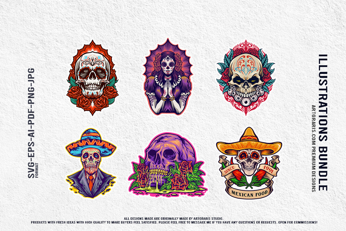 Mexican Festival Skulls and Da de los Muertos Illustration Set