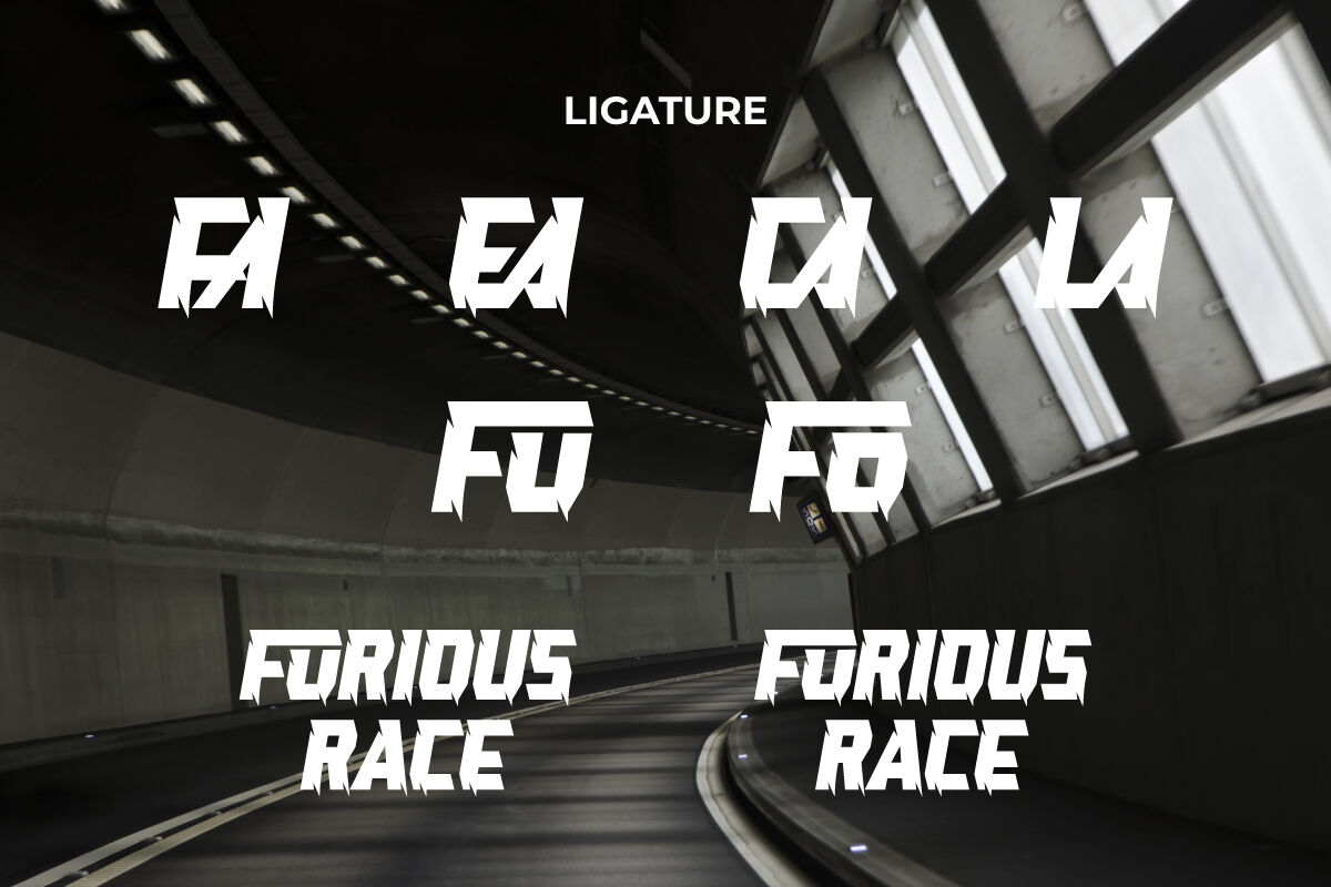 Furious Race Font includes a complete set of ALL CAPS for upper and lower case letters, Numbers, Punctuation and Symbols. Also, the no less interesting Ligatures add artistic value to this font. The display font dynamic and sporty, designed for those who crave the action of speed and power. Use it for automotive, clothing brand, racing game, sports events, and other creative project.