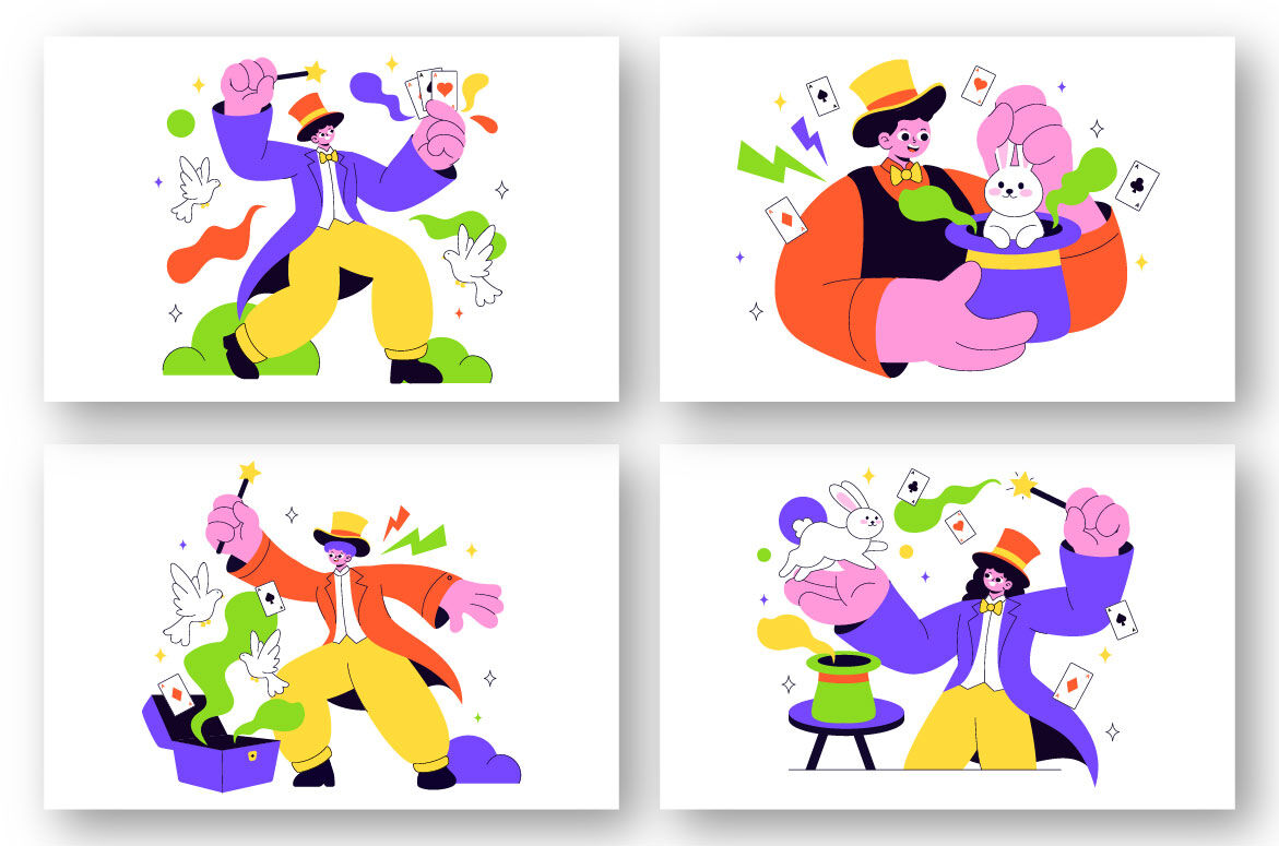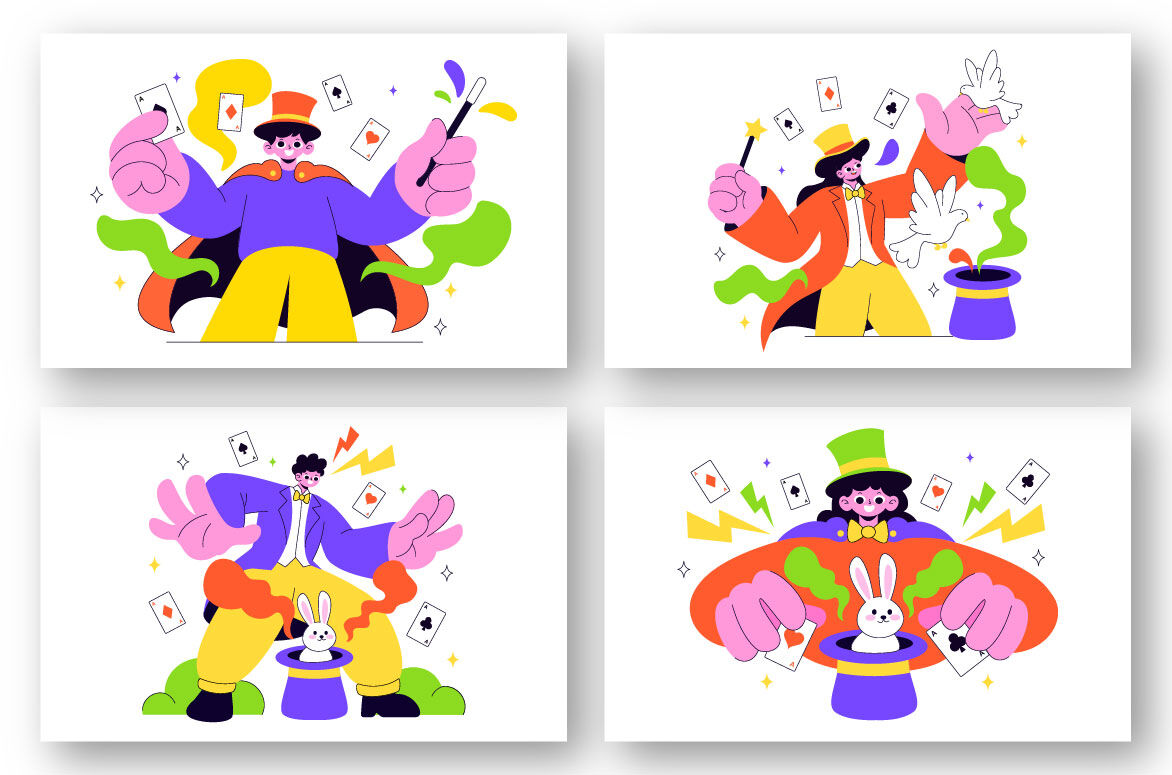 Magician Vector Illustration with Illusionist Conjuring Tricks and Waving a Magic Wand above his Mysterious Hat on a Stage in Flat Cartoon Background Suitable for Poster, Web Banner, Brochure, Landing Page and Others Background Template Features:    - Fully editable vector files, easy to edit the object, color and background     - Include 100% vector Ai, Eps 10, SVG    - PNG transparent background    - Include Psd Photoshop ( non grouped / unlabeled )    - Layered    - Preview jpeg    - Help File, to view more file properties    - Enjoy and don't hesitate to contact us    - Thanks :-)