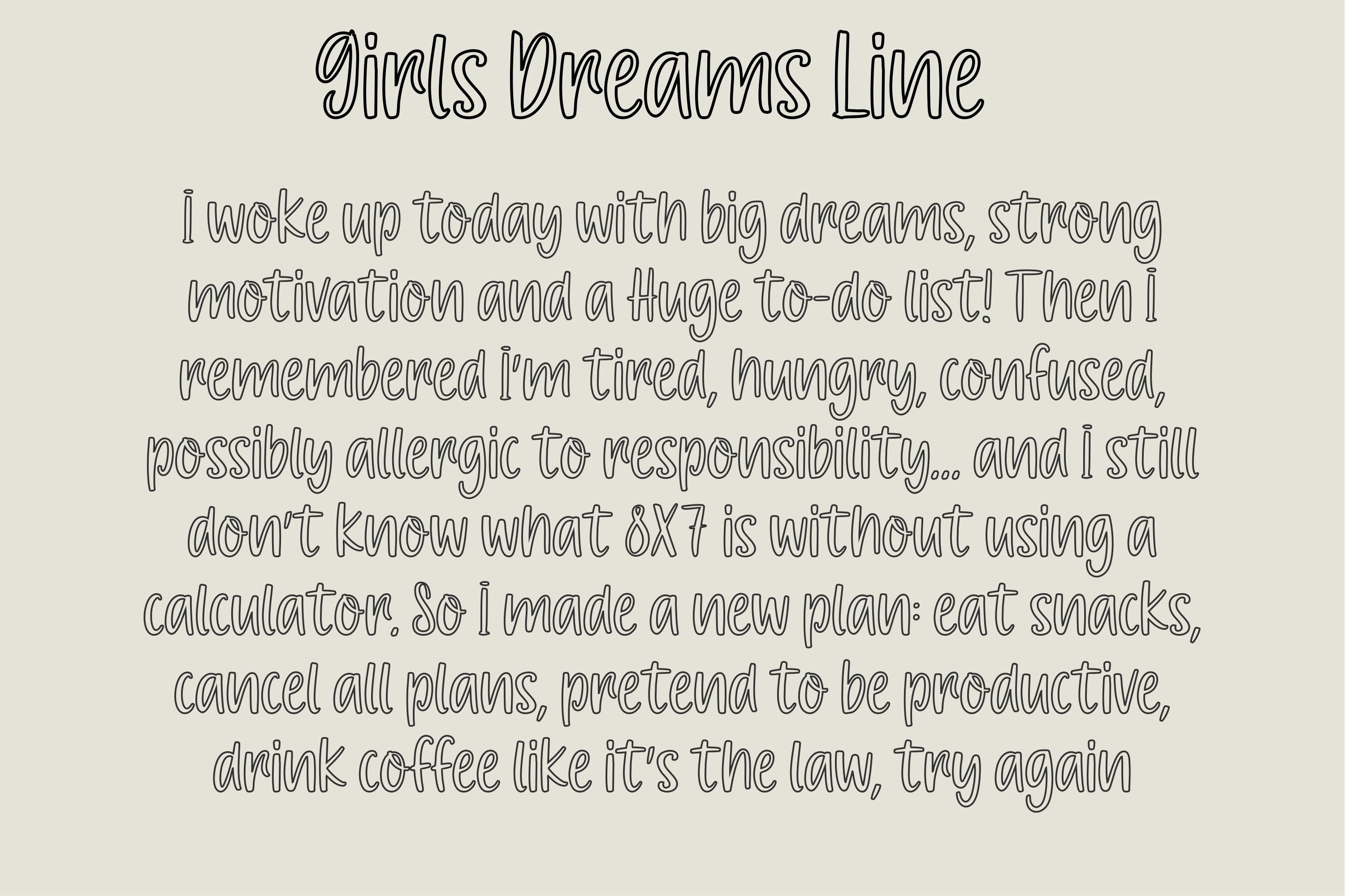 Introducing Girls Dreams – a playful handwritten font family with three charming styles: Regular, Bold and Line. Designed to bring joy, creativity and a natural handwritten feeling to your projects, this font is perfect for planners, stickers, classroom materials, Goodnotes pages, student worksheets, social media posts and quotes. Each style has its own personality: the Regular version gives a relaxed handwritten flow, the Bold version stands out beautifully in titles and quotes, and the Line version is ideal for outlines, coloring pages, layering and notebook designs.