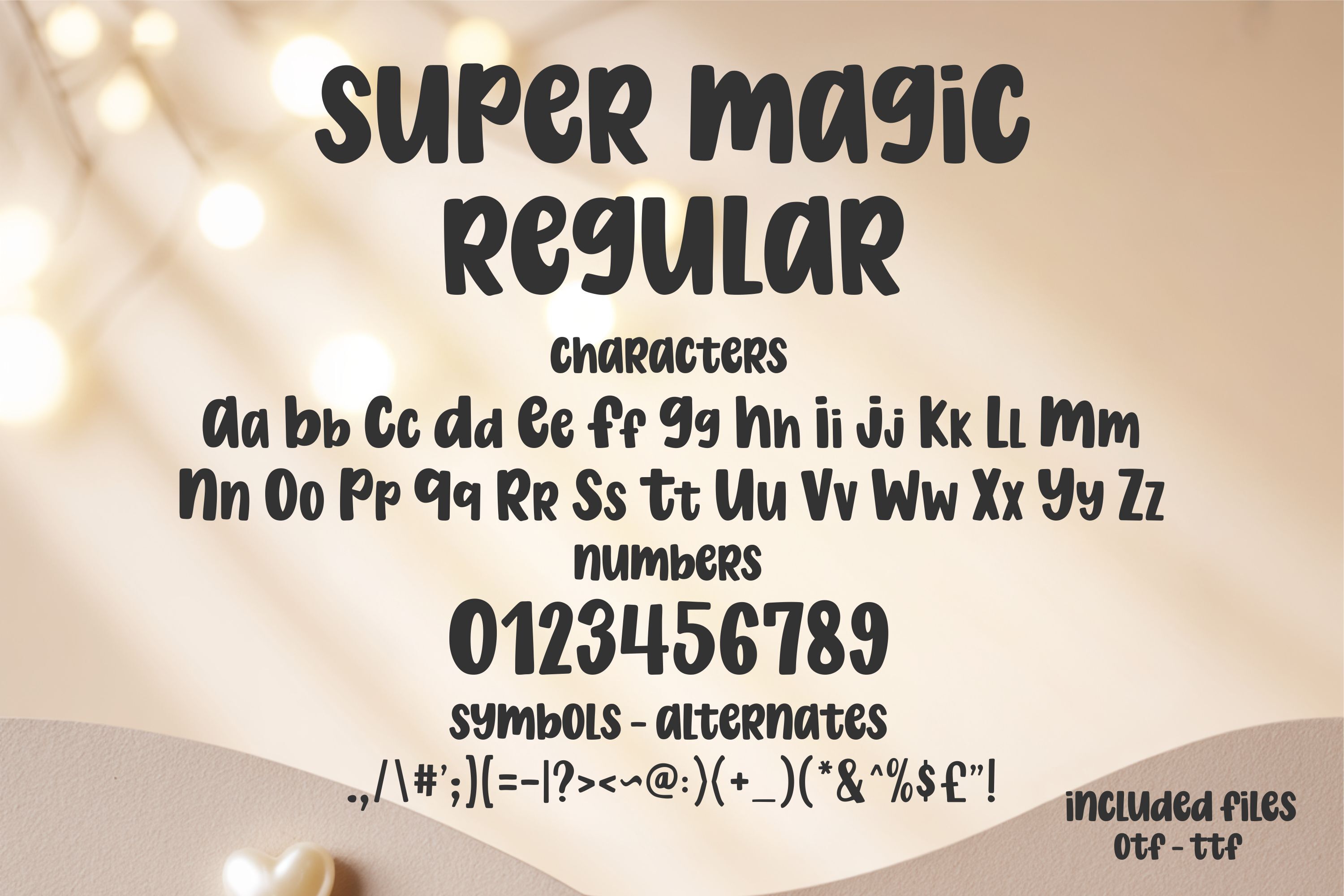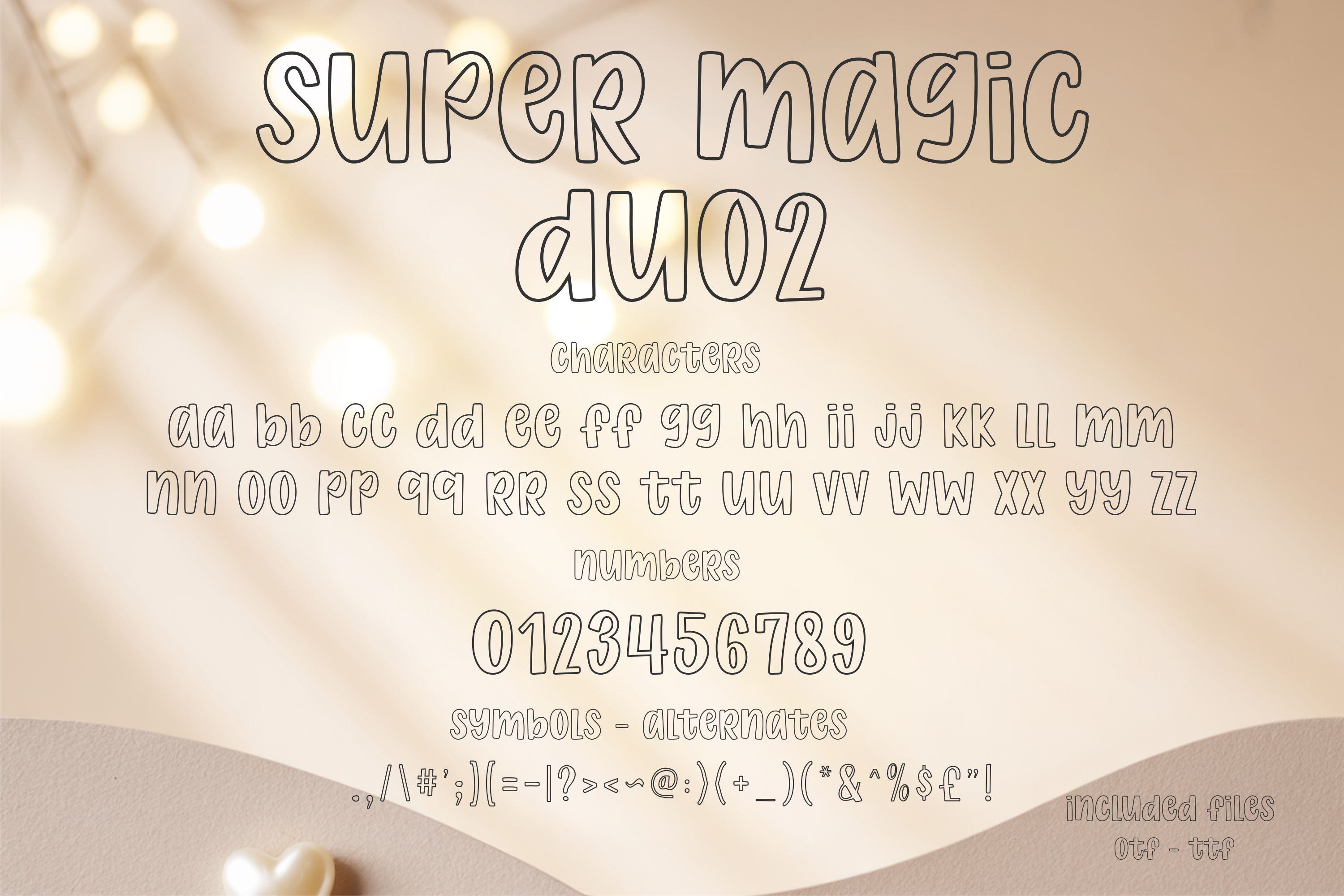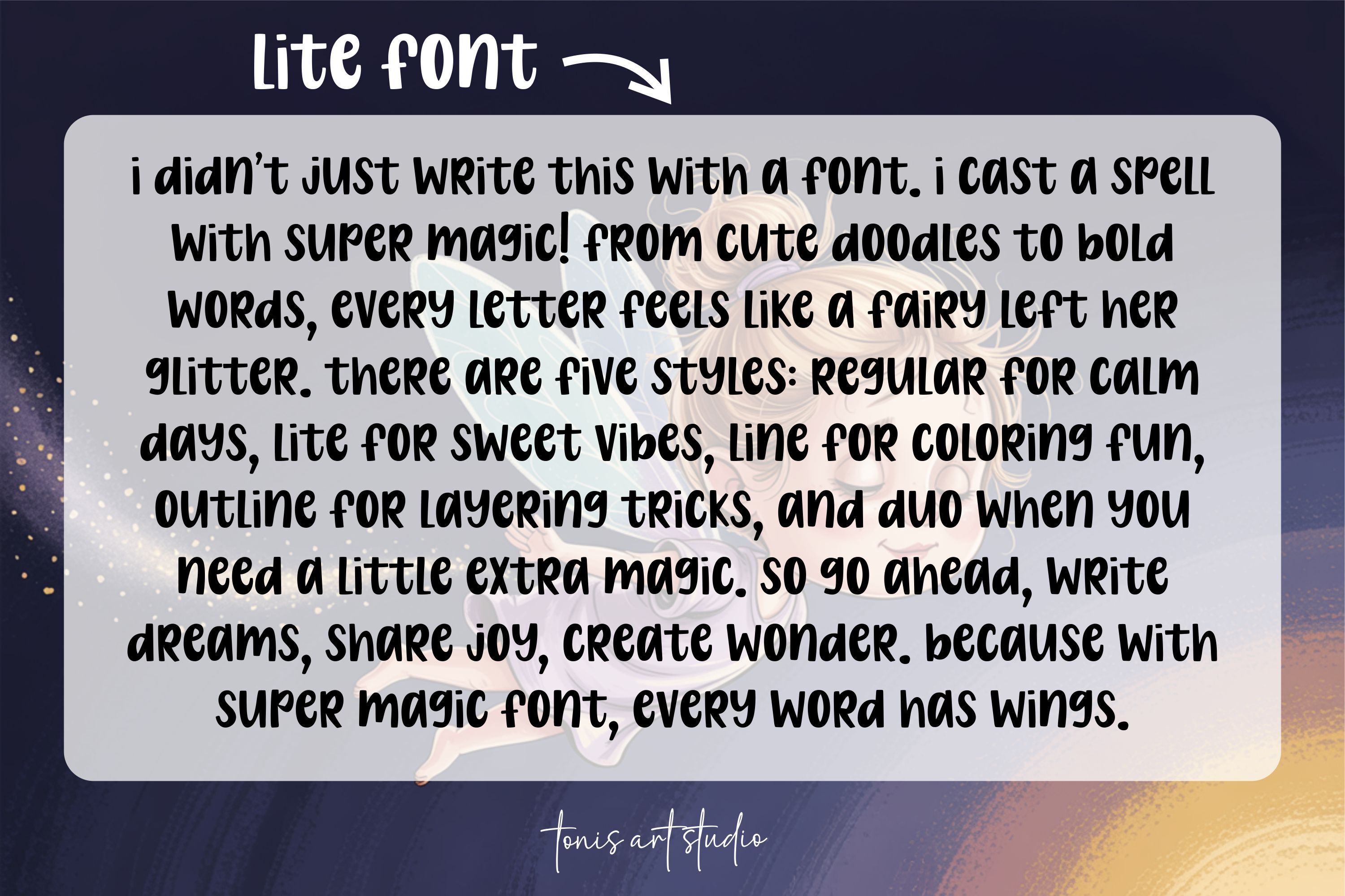 The Super Magic Font Family includes Regular, Lite, Line, Outline, and Duo, a playful handwritten display typeface designed to sprinkle charm and creativity on every project. With bubbly curves, rounded edges, and a joyful personality, this font family captures the fun and fantasy of imagination. Whether you design for kids, teachers, crafts, or cute quotes, Super Magic brings fairy-tale energy to your work.